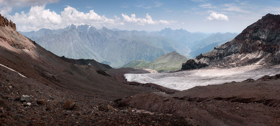 С ледника уже видно старинное здание бывшей метеостанции (3675 метров н.у.м). Нынче там за плату предоставляют твердую крышу над головой. Также имеется столовая и некое подобие организованного, но добровольного учета прибывших или проходящих. На стене здания четко видна надпись на инглиш “стоянка - 10 лари”.