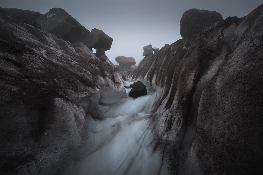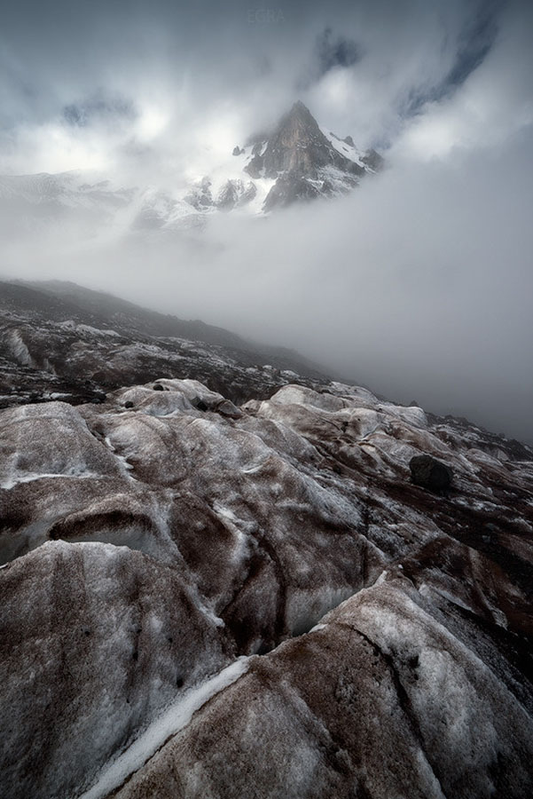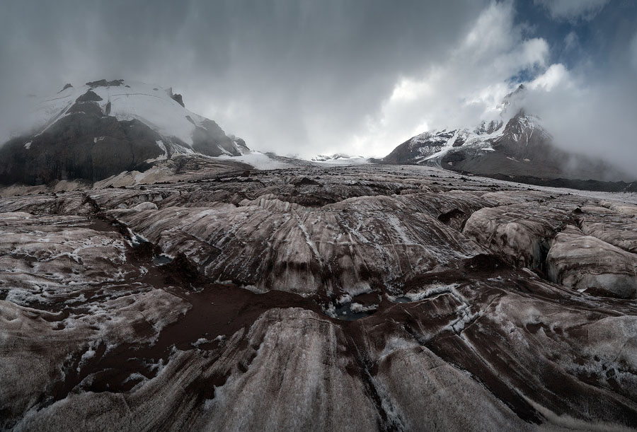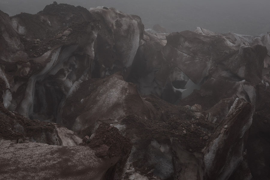 Здесь, наверное, открывается душещипательный вид, но мы об этом не узнаем, так как плотный туман неотрывно сопровождает нас всюду. В нем же мы возвращаемся на стоянку, где в течение оставшегося дня будем периодически слышать грохот обваливающихся скал и прочую какофонию. Глядя на все происходящее несложно догадаться, что весь здешний ландшафт находится в постоянном и непрерывном изменении: замерзает, тает, откалывается, разбивается, осыпается, утекает...