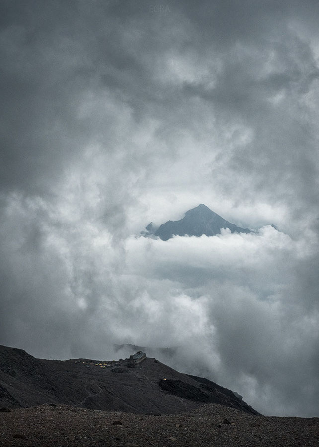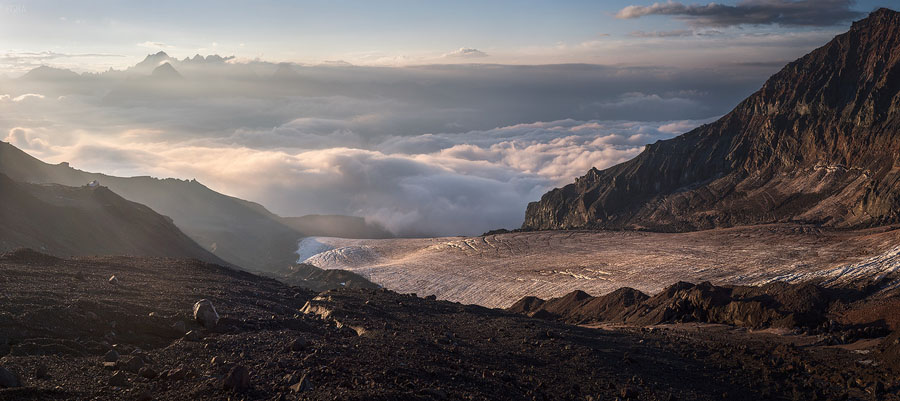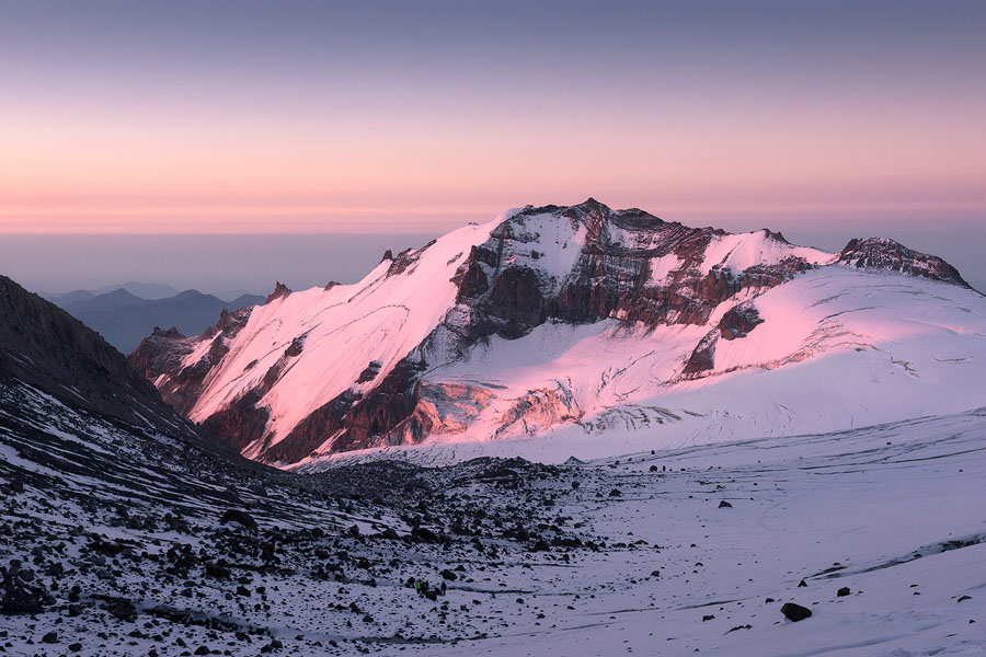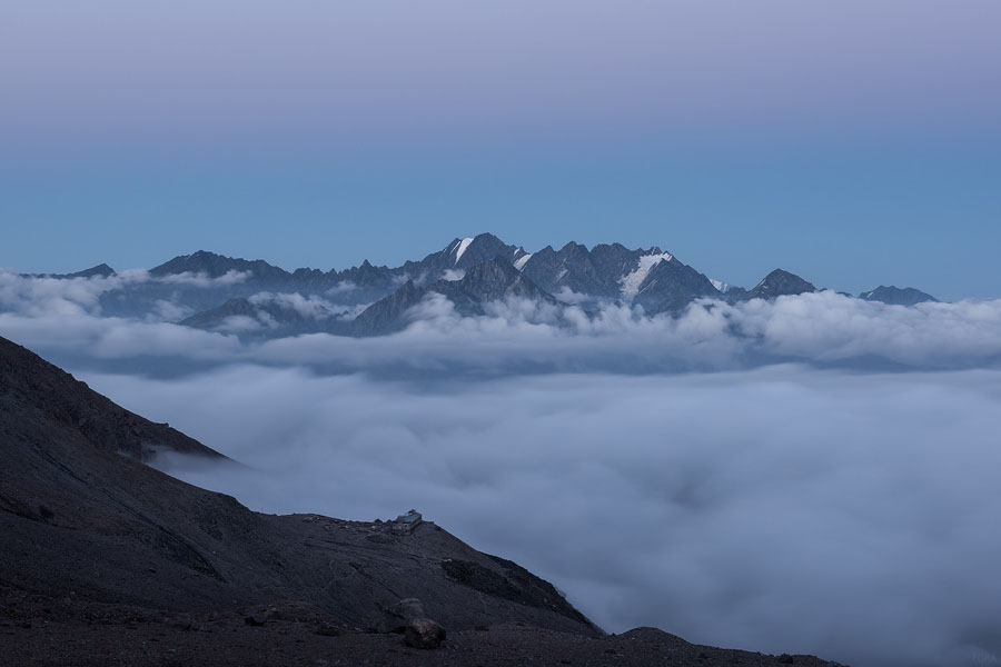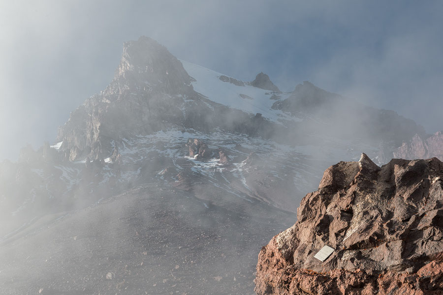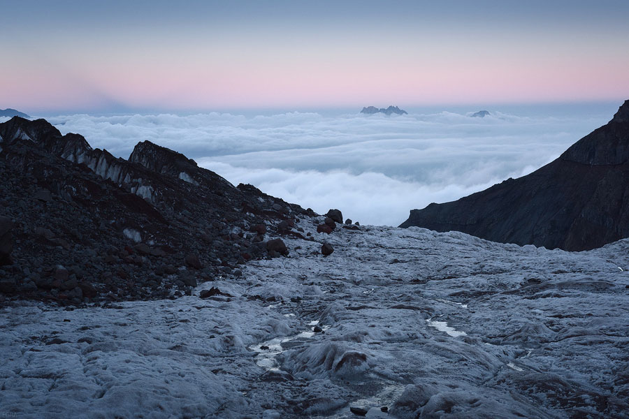 Снова не идем на вершину. Снова “нелётная” погода. К тому же по наблюдениям бывалых и их опыту, сегодня - лавинная опасность. Мы отошли от намеченного плана на два дня. Теперь уже вся территория лагеря пуста - мы тут одни. Да и если б не удача - нам бы уже нечем было питаться и пришлось бы тоже спускаться. Даже у метеостанции внизу виднеется буквально пара тентов. Видимо, погода окончательно спугнула всех желающих. И хоть рассвет был необычайно безмятежным и идилличным, вскоре облака снизу снова натащило на нас. Гора явно не торопится подпускать к своему пику, как будто выдерживает характер, проверяя истинность нашего стремления.