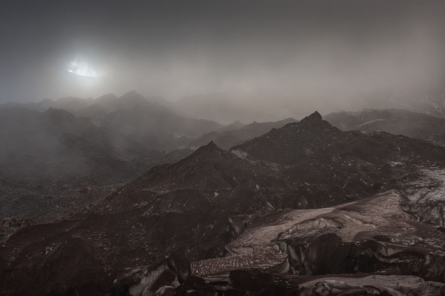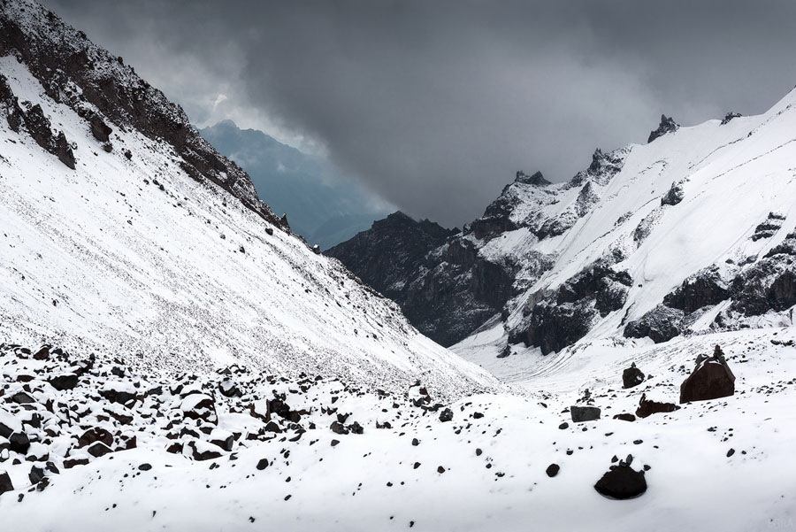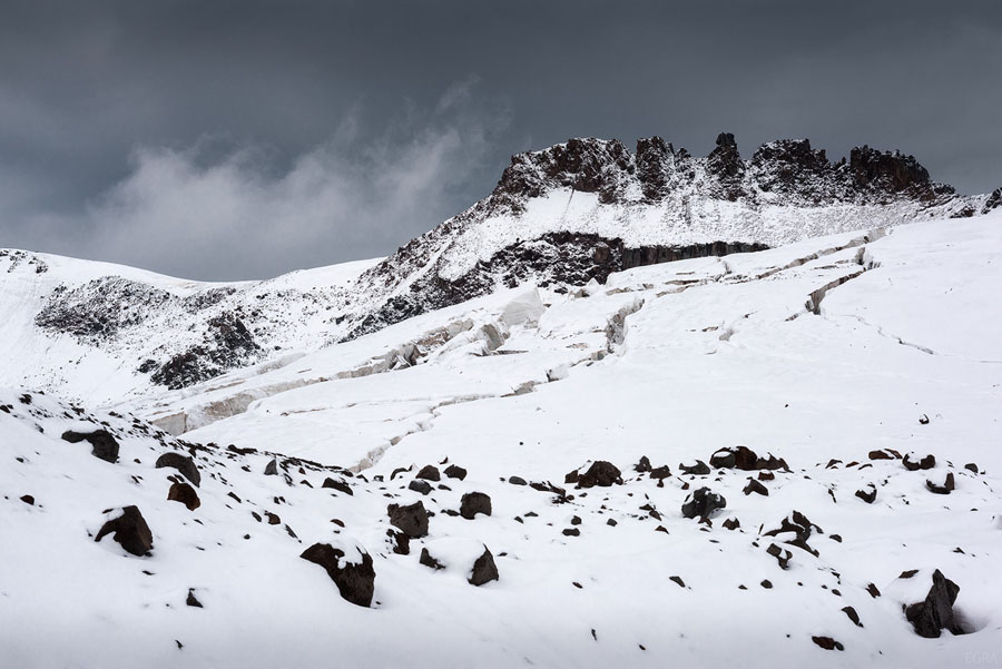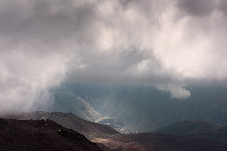 За все время нашего пребывания на горе, здесь произошло несколько несчастных случаев. И хоть по альпинистским меркам Казбек не считается особо трудным для восхождения - на его склонах покоится предостаточно трагедий. Крутость гор если и оценивать, то не только их характером, рельефом и особенностью климата, но и в том числе человеческими факторами: неосторожностью, самонадеянностью, жаждой невозможного. Ну и, конечно же, от случайностей никто не застрахован. Все же любая гора - это зона риска. Однако, по всей видимости, среди альпинистов куда больше людей с обостренным инстинктом самосохранения. Мы встретили много не дошедших до цели (по причине плохого самочувствия, истощенного провианта, поджимающих сроков или погоды). Все же именно она, погода - фундаментальный фактор в горах. Мгновенные её перемены здесь чувствуются особенно обостренно, ибо никуда толком от этого не скрыться - лишь вовремя покинуть стоянку, уйти вниз.