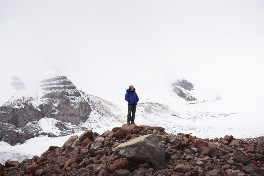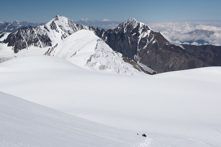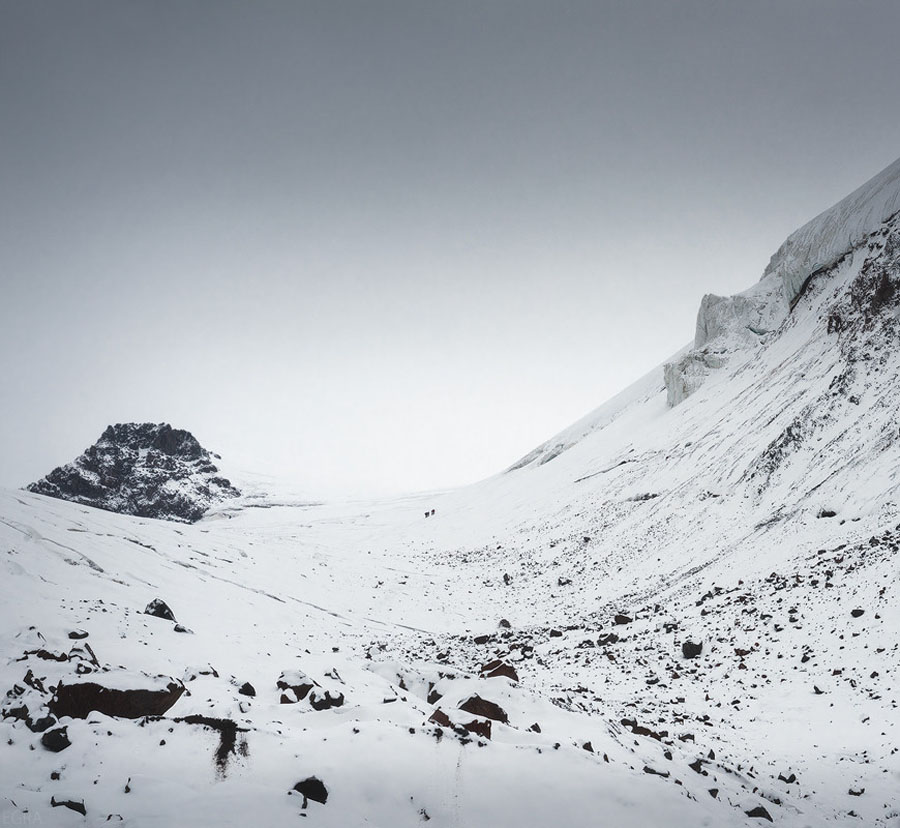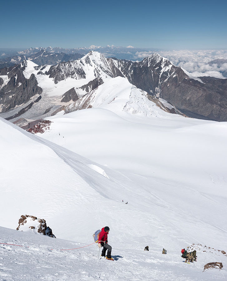 В этот день я подолгу наблюдал, как туда-сюда бегает облачный туман, то накрывая нас, то опускаясь, открывая доступ света, а мы находимся прям на этой границе. Заприметил также, как Анатолий задумчиво смотрит ввысь, то ли изучая возможности, то ли скучая по ним. В случае удачного восхождения этому человеку останется подняться еще на одну гору, и он станет обладателем редкого и почетного среди альпинистов титула “Снежный барс России”. Забавно, что мои спутники с улыбкой говорят обо всех этих формальностях: учет нахоженных километров и вершин, ведение статистики собственных заслуг и общественного признания.