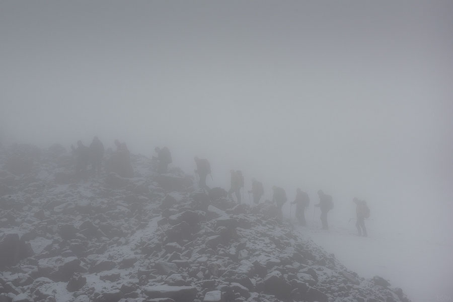 Утро - в столь плотной пелене тумана, что почти не видны уже привычные силуэты валунов вокруг лагеря. И когда я крутился в поисках интересных кадров, заметил еле различимую молчаливую вереницу теней спасателей, шедших наверх.