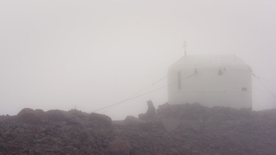 Сплошное ожидание будто витает в воздухе. Появилась идея, чтобы совсем не заскучать, сходить на часовню - местную достопримечательность. Будет нам заодно еще одна акклиматизация. К тому же этот путь лежит через “метеостанцию”, где можно наверняка чуть развеяться и найти еще какой-нибудь еды. Сказано - сделано. Под крышей, действительно, немного полегчало. Нашлись попутчики "сбегать" с нами на намеченную горку.