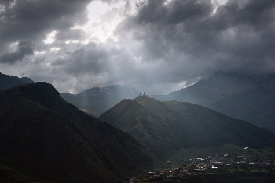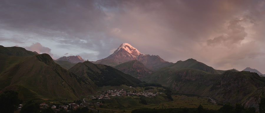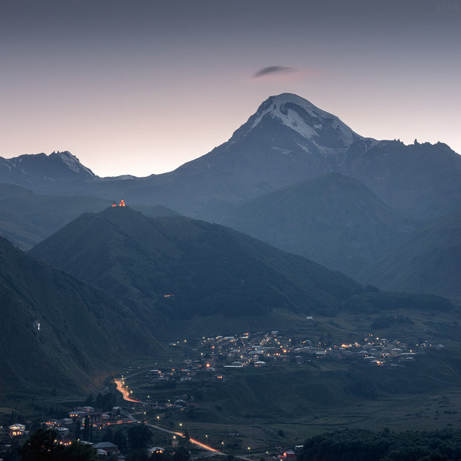 Долго ли, коротко ли, в окнах забрезжили призрачные горные силуэты. И вот мы уже в столице Северной Осетии - поторговались с местными таксистами, выяснили как лучше перемахнуть в Грузию, не теряя на это времени, и посреди того же дня очутились у подножия Казбека, в поселке Степанцминда, который находится уже на высоте 1744 метров над уровнем моря.