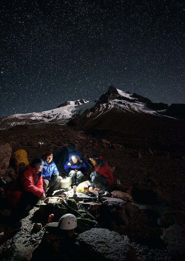 Готовить еду пришлось в тамбуре, ужинали в итоге вчетвером в 2х-местной палатке - зато уютно. Все как-то подобрели. Видать, проветрились не зря. Теперь уже разговоры про горы мне намного понятнее и ближе, лексикон не вызывает недоумения за редким исключением. Говорят, что на восхождение может уйти часов 9 в одну сторону - думать об этом как-то жутко...