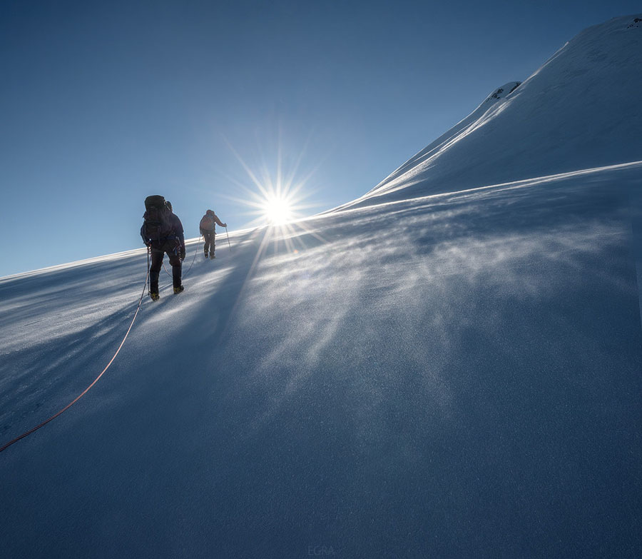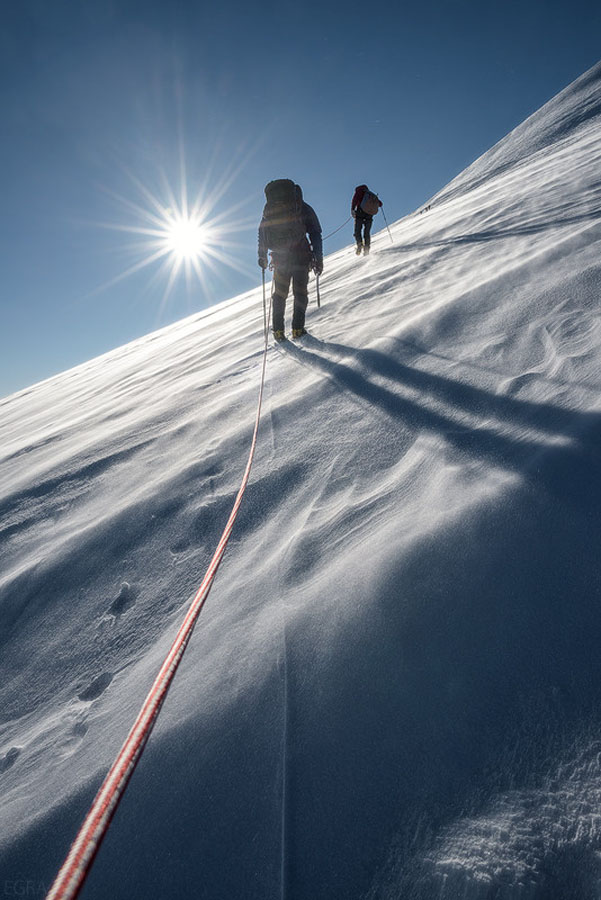 Всего за пару часов мы буквально влетели на перевал. По дороге застали рассвет - первые лучи легли на гору напротив лагеря, что остался внизу. Все надели железки, веревки, очки, намазались кремом от загара и пошли в связке. На плато, откуда начинается “финишная прямая”, солнце коснулось и нас. Мои спутники преобразились, их недавняя расхлябанность, несерьезность и сумбурность куда-то испарились, уступив место героям романов. Я подобные картинки встречал лишь, или воображал где-то там. А вот они уж предо мной – стойкие силуэты в суровых условиях: жесткое солнце, снежная пыль, рьяный мороз. И все взаправду - происходит и со мною, я тоже здесь, сейчас! Аж дух захватывает! А какой здесь звонкий воздух, чистые цвета, полное ощущение некой стерильной среды, будто уже в космосе...