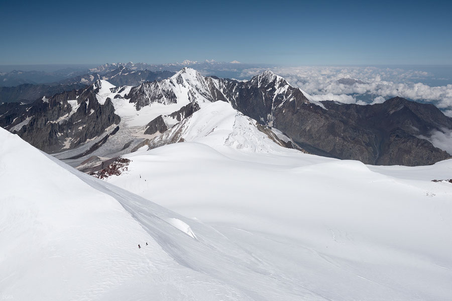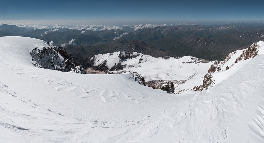 На вершине - целая толпа. И еще подходят. Многонационально. Отметился и известный грузинский альпинист Бедзина. Верхняя точка Казбека весьма компактная, при таком раскладе здесь становится тесновато. И летят отсюда во все стороны ликованье и возгласы. А вокруг - горы, горы, горы... сколько хватает глаз. 5 тысяч метров над уровнем моря, а когда забираешься сюда, то кажется, что и - над уровнем оставшегося под ногами ландшафта. Окрыляющее чувство заполняет душу - кажется, что достиг вершины мира! Вдали хорошо виден большой брат Эльбрус. Вон самолет летит на уровне горизонта: на такой же высоте, что мы сейчас стоим.