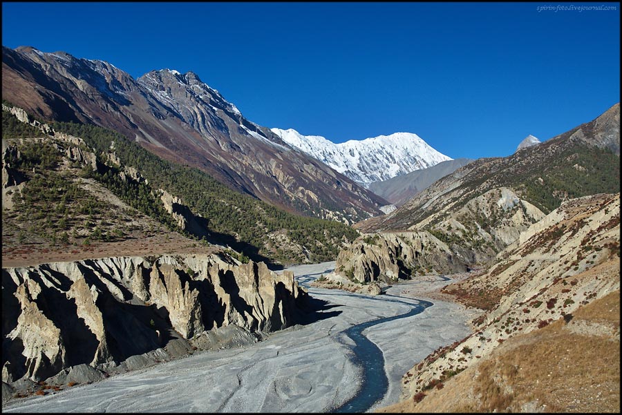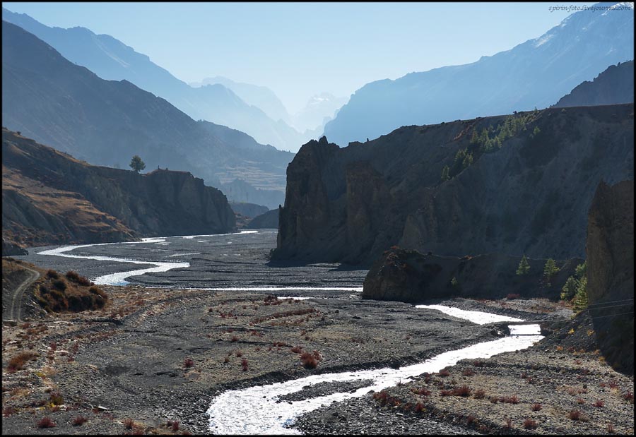 А это взгляд назад по той же долине. Река серебрится в контровом свете, а вдали виднеется массив Манаслу (семитысячники Нгади Чули и Хималчули):