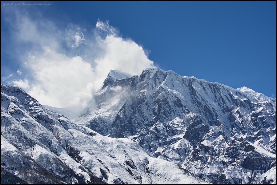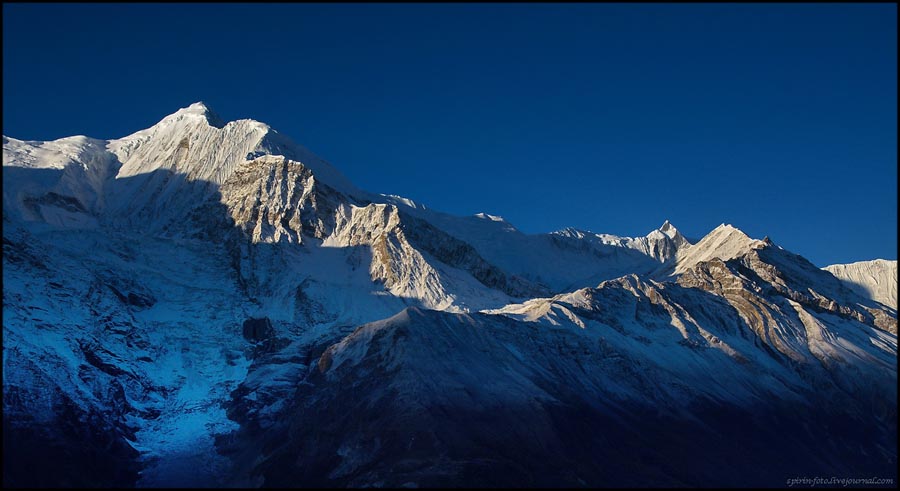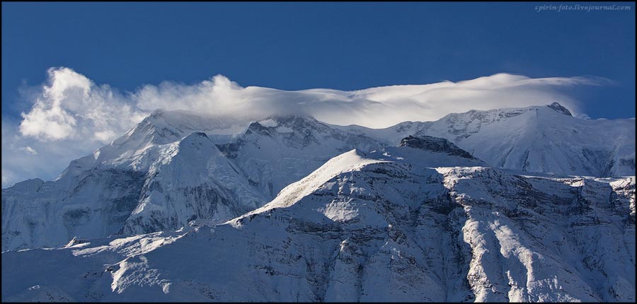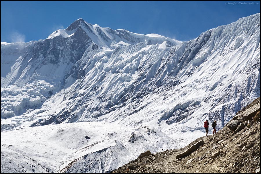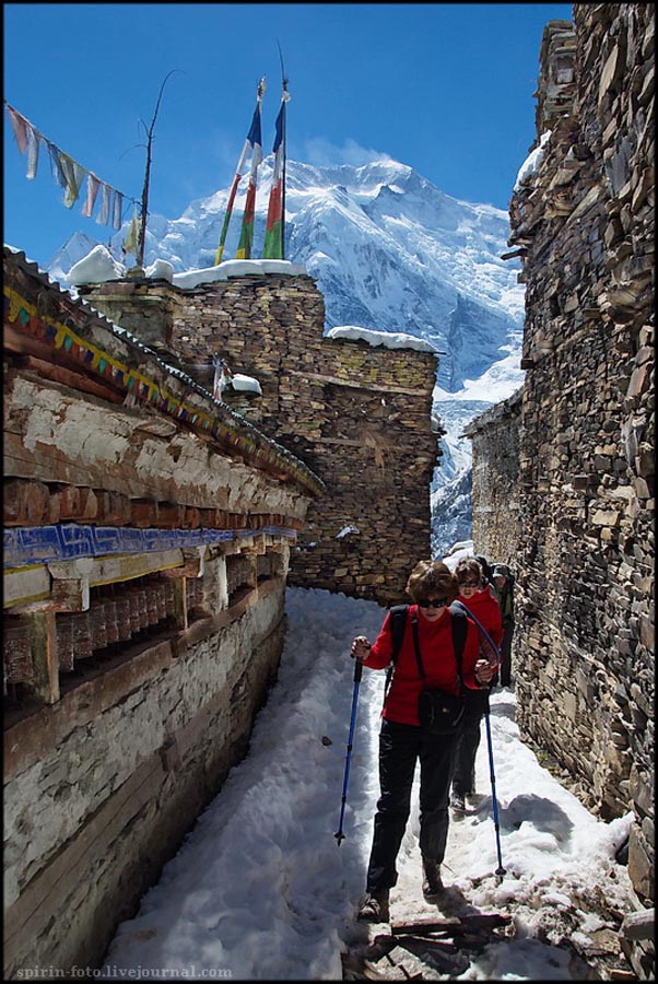 По мере отдаления от Мананга, массив Манаслу вырастает все выше (теперь уже и саму Манаслу видно слева, а не только Нгади Чули и Хималчули)