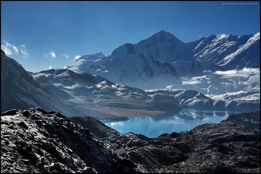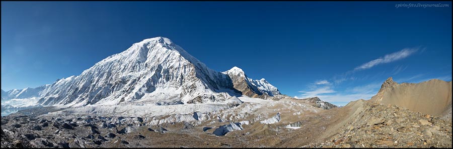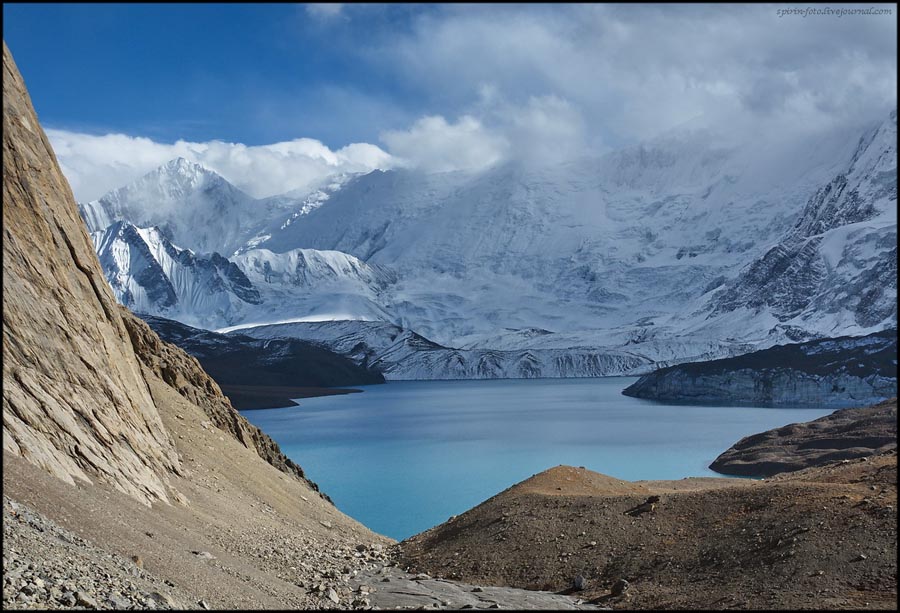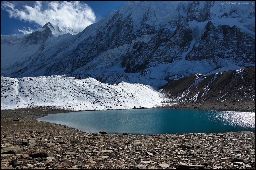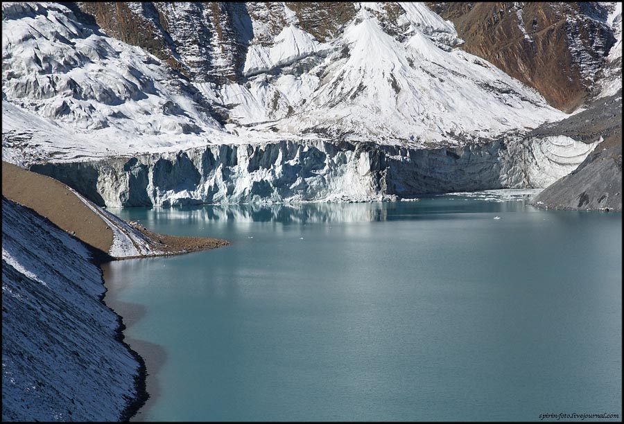 Обращенный к пику Тиличо берег озера - это сплошной ледник, сползающий со склонов горы. По большей части поверхность ледника покрыта камнями и грязью, но там, где ледник обрывается круто вниз, лед чистый - благодаря свежим сколам (ледовые обвалы там - регулярное явление):