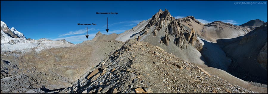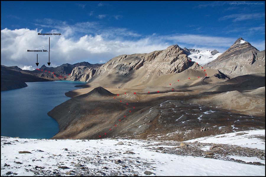 Пунктиром обозначен путь в обход озера Тиличо (в прошлый раз мы ходили через Западную седловину Мессоканто, а на этот раз пойдем через более простую Центральную седловину):