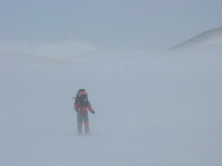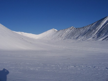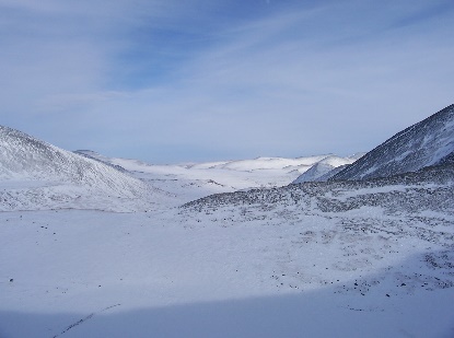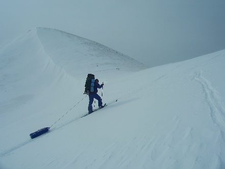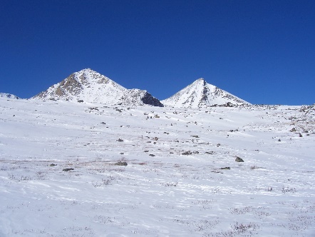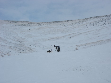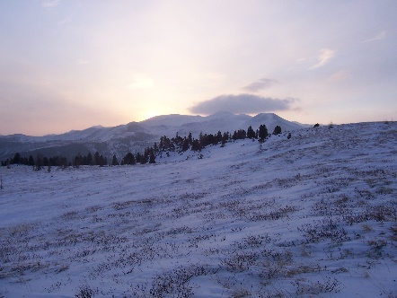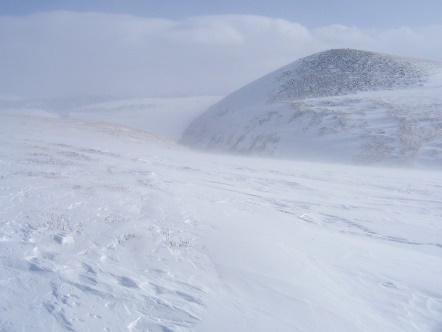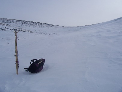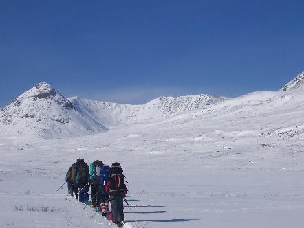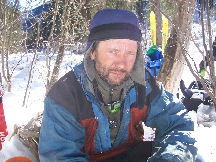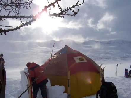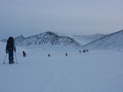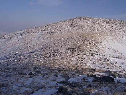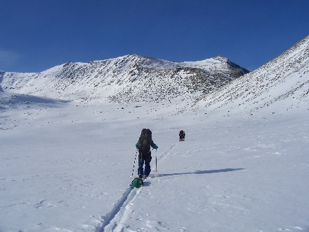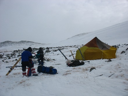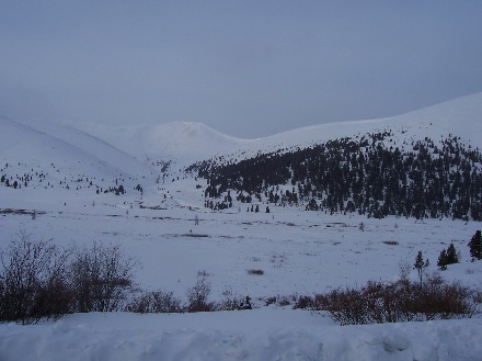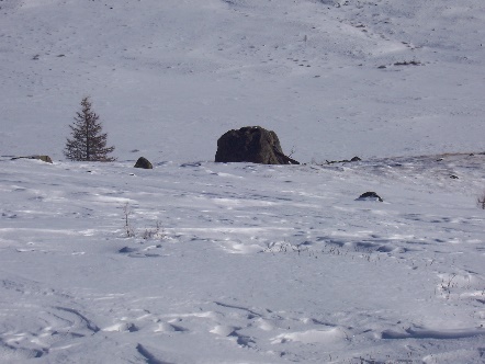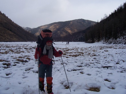 23.02 Температура – 18°С. Выход 8:0000. За 2 перехода дошли до начала подъёма. В 10:00 поднялись на плато к подножию вершины Позарым. Достаточно жёсткий фирн, дует встречный ветер. За 40 минут обошли куполообразную вершину слева (по ходу) и спустились к ручью Самжир. Снег не глубокий 0.3 – 0.4 м. под снегом сплошные заросли карликовой берёзки. Пересекли левый исток р.Самжир и через 20 минут на правом истоке реки пере подъемом под защитой крутого склона от ветра встали на обед. 11:30. Выход с обеда в 13:45 поднимаемся на водораздел на расстоянии 200 – 150 метров от каньона по левому борту долины. 14:00 поднялись на плоский водораздел. Впереди плоское заболоченное плато постепенно понижающееся и преходящее в долину реки Хайрлигмес. Видимость 1-1,5 км. Пересекаем плато сильно дует встречный ветер, плотный фирн, редко встречаются заструги. Постепенно проявляется скалистая громада массива Эри-Тайга. 15:05 группа на перегибе плато в долину реки Хайрлигмес, начинаем спускаться в долину по правому борту долины, снег переменной плотности приходится тропить по очереди. В зоне леса на первом правом притоке реки Хайрлигмес встали на ночёвку в 16:05. Вода из ручья.