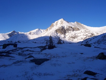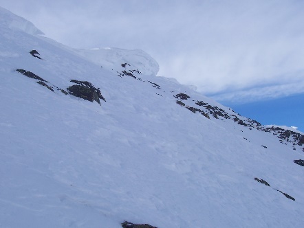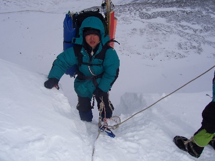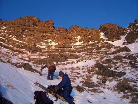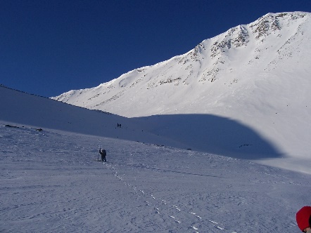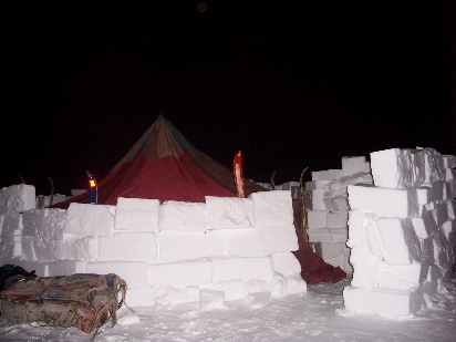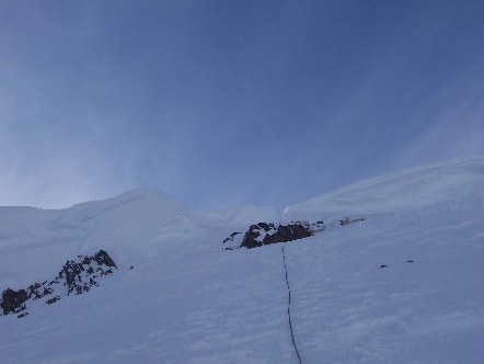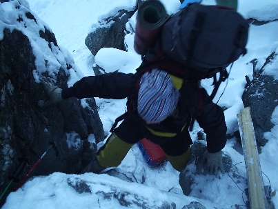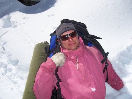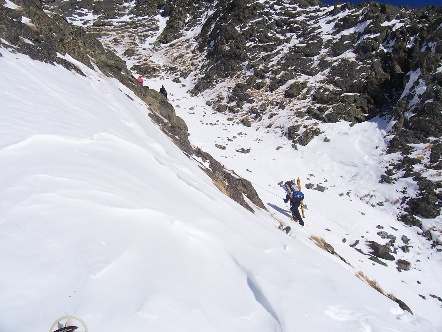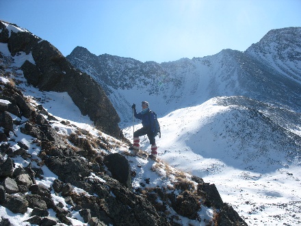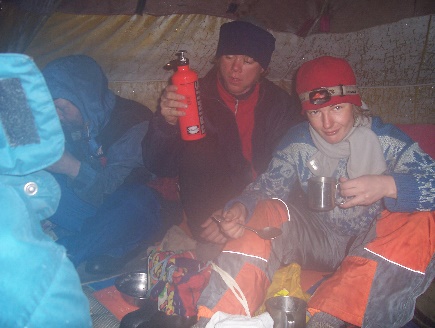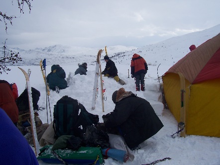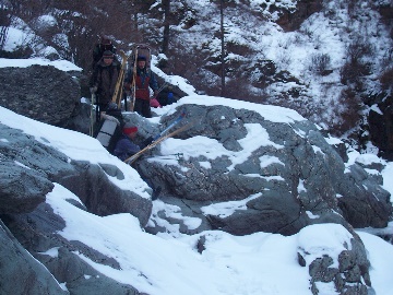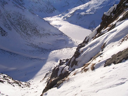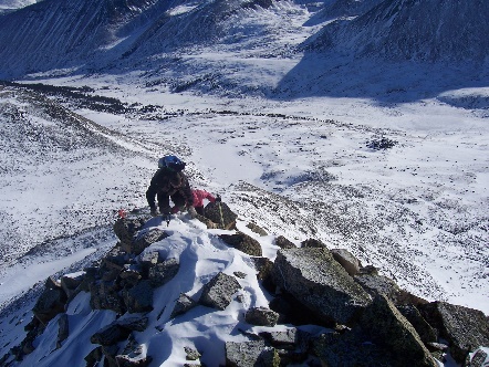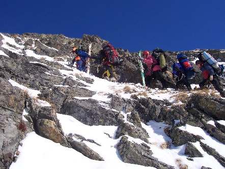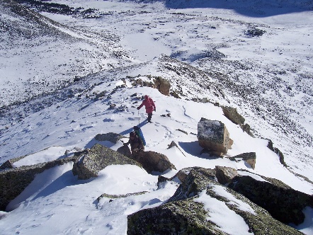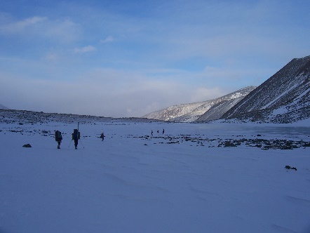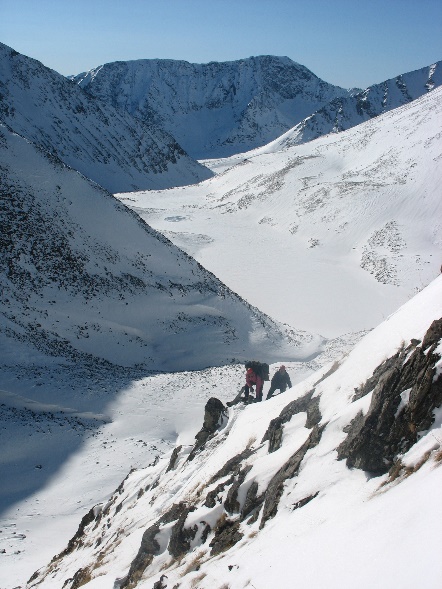Обед 11:50-13:30. Пока готовится кипяток на горелках из снега, организовали станцию и навесили 50 м перил. Иван Горлов лопатой пробил траншею для начала спуска. Нависающего карниза действительно не оказалось. Одеваем страховочные системы и каски, собираем палатку. Спуск с верхней страховкой по перилам с использованием восьмерок. Почти вертикальный участок карниза выводит на широкое ребро крутизной 50-55°. Склон снежно скально-осыпной. Экспозиция склона вогнутая. Глубина снега 30-40 см, наст на камнях переменной плотности, на открытых участках – твердый. Навешиваем еще 50 м перил. Здесь с трудом находим место для скальных крючьев и организуем следующую станцию. Навешиваем перила 50+50 м. Этот участок технически более сложен,хотя крутизна несколько меньше. С ребра уходим влево на снежный склон не выходя на снежные поля. Дальше спускаемся без веревок. При прохождении определяющего склона перевала было использовано 5 станций за камни и скальные крючья, 200 метров перильной страховки и 100 метров спуска с самостраховкой. Выход на озеро последних в 19:00. Ставим палатку на озере на лавинобезопасном расстоянии от склона. Воду берём из озера. Готовим на горелках. Холодная ночёвка за бортом температура – 30°С.
