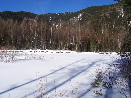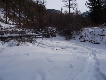 20.02 Выход 8:25. Температура – 14° С. Идём по летней тропе, лыжи несём в руках, лес заболочен, очень густой подлесок. Тропа регулярно чистится, пропиливается охотниками. Через 25 минут хода вышли на правый приток реки Мунгашколь. Выше притока река разбивается на два русла и в месте их слияния разливается в озеро, причем, несмотря на тихое течение и малую глубину, зимой не замерзает, видимо в силу того, что питание реки происходит из-под морен озёр Пичи и Улуг Мунгашколь. Мест для стоянок нет. В 9:20 вышли к переправе через реку Мунгашколь по бревну. Встретили косулю, людей не боится но ведёт себя очень осторожно. Много следов пребывания кабанов. Почти сразу за переправой тропа начинает уходить вправо на мощную морену озера Пичи Мунгашколь. Подъём на морену не крутой 20°-30° по тропе, много курумов, поросших мхами и кустарниками. Привал на вершине морены 10:00-10:10.