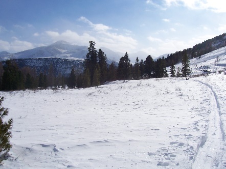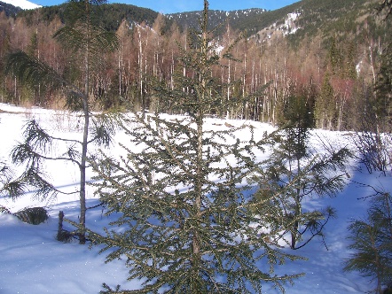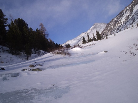 Полуднёвка. Ремонтируем снаряжение, отдыхаем, наслаждаемся отличной погодой. 02.03 Выход в 8:30. Идём по левому борту долины реки Снежная. Тропим по очереди с рюкзаками, снега 0,3-0,4 м. в нижней части долины старый горельник. В 12:00 встали на обед на правом истоке реки Каратош. Группа энтузиастов протропила лыжню. 13:20 выход с обеда. Набираем высоту, срезая угол между реками Каротош и Кайлюза. Поднялись по правому борту долины реки Кайлюза до границы зоны леса, обойдя каньон при впадении Кайлюзы в реку Каратош. Снег глубиной 0,4 м, на границе леса наст переменной плотности. В 16:40 встали на ночёвку на границу леса в 40 минутах ходьбы от входа в цирк перевала Западный.