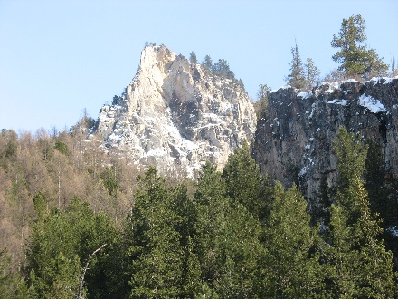 05.03 Выход в 8:00. Температура – 12°С. Идём по реке вниз. Правый берег реки сложен карстующимися породами, высокие причудливые скальники, характерные карстовые провалы. Идём по лыжне, при приближении к реке Карасума лыжня уходит налево на гору, срезая угол между реками, обходя неудобный каньон. Обед на реке Карасума в 12:50. Выход с обеда в 14:30. Идем по лыжне на расстоянии 0,5 км от реки по высокому левому берегу. На втором притоке спустились на реку Карасума. По реке вышли к началу лесовозной дороги (до указателя «Заповедник Хакасский» проход запрещён). И на берегу встали на ночёвку. 17:10.
