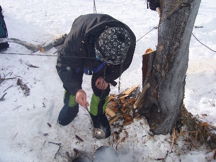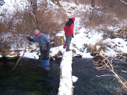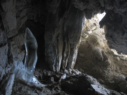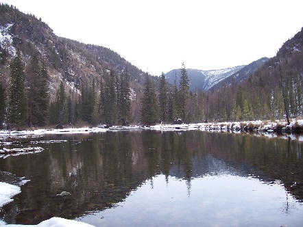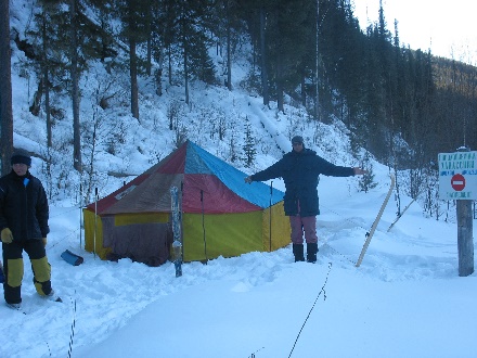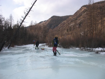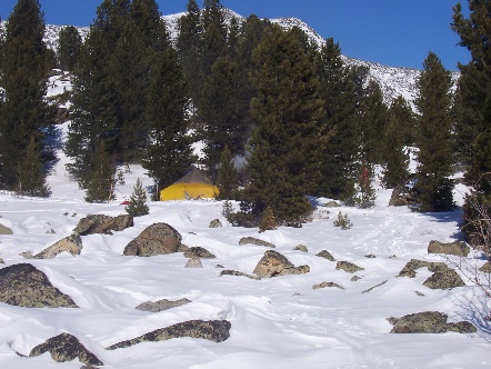 4.03 Выход в 800. Температура – 12°С. Спускаемся с озера в долину реки Кызыл-Кызыксу, замечательное катание на лыжах. 1030 вышли на лыжню охотников, пришедших с перевала Кызыл – Оюк. Идём вниз по реке, тропим, погода замечательная. Обед 12:15 – 13:10 на правом берегу напротив левого притока Перетхем. На слиянии рек Перетхем и Кызыл-Кызыксу стоит хорошая изба охотников, на 6 человек. Далее через каждые 3–4 часа встречаются избушки охотоведов, поддерживаются в хорошем состоянии. По реке часто встречаются промоины. Из-за поломки крепления, на ночёвку встали в 16:20, недалеко от места ночёвки была найдена пещера, протяженностью около7-8 метров.