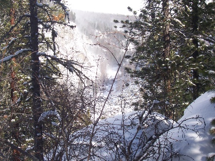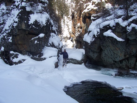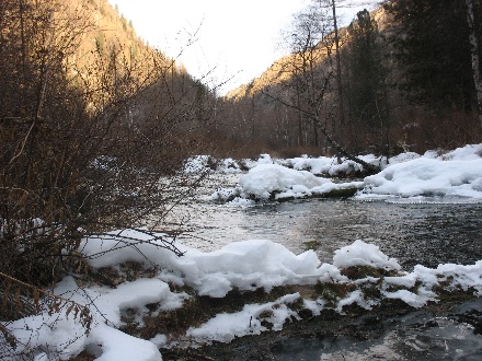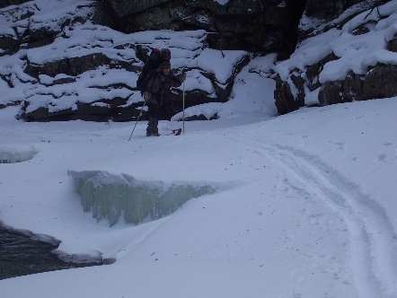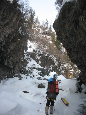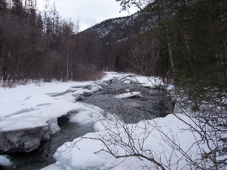Приходится тропить первому без рюкзака, глубина снега 0,4-0,5 м. Стены каньона стали несколько ниже до 10-15 метров, иногда на склонах растут кусты и деревья. 11:40 небольшая поляна удобная для стоянки на ночёвку или обед, видны окрестные вершины. 11:50 снова входим в каньон. В 12:30 встали на обед. В 13:45 вышли с обеда, завершающий участок каньона можно обойти по левому (орфографически) берегу. Т.к. на выходе из каньона мощный порог, с участком открытой воды, приходиться карабкаться свободным лазанием по правому борту каньона. Каньон после обеда проходим за 45 минут. Выше каньона тропёжка по реке, глубина снега 0,4-0,5 м. часто встречаются обширные наледи, часто мокрые. В 16:40 встали на ночёвку на левом берегу реки Манагы.