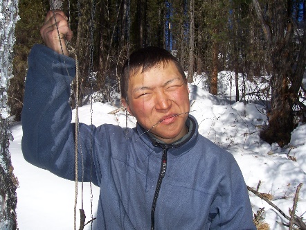В 1410 дошли до охотничьей избы на 5 (сухом) притоке. Изба жилая на 5-6 человек, пообщались с охотниками и в 1420 выход. 1440 дошли до 6-го (сухого) притока. Идём по реке по наледям. Скорость движения 5км/ч. 1550 в 2 км выше р.Чадарлы встали на удобную ночевку. 19.02 Выход в 8 :25. температура –14°С. Идём по лыжах в основном по реке, иногда обходим завалы и участки открытой воды. За 3 перехода и 2 привала по 5-10 минут дошли до слияния рек Курукуль и Она в 9:55. Местами – без лыж. В устье под скалой уходим на левый берег р.Курукуль, срезаем по кустам и выходим на берег р.Она. По р.Она идём в основном берегами, т.к. много открытой воды. Снега 10-15 см. За 3 перехода дошли до устья реки Субурдук и в 11:40 встали на обед. Выше впадения р.Субурдук река Она на старых картах носит название Мунгашколь. Выход с обеда в 13:10. Река по-прежнему открыта, движемся правым (орфографически) берегом, уклон заметно возрастает, тропа ухудшается. За 2 перехода дошли до места ночёвки в 14:30. Удобное место для ночёвки не доходя до правого притока около1,5 км. на правом берегу. Много берёз, осин и тёмнохвойных пород, лиственницы.