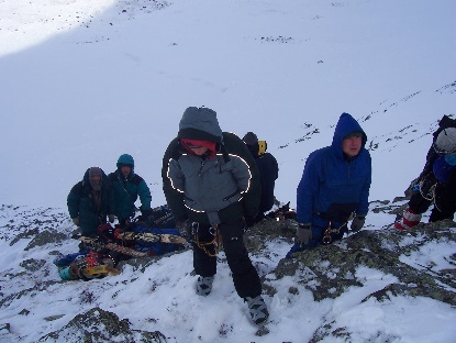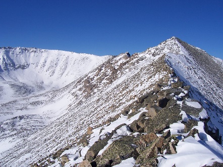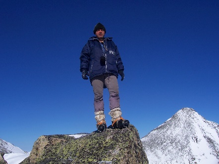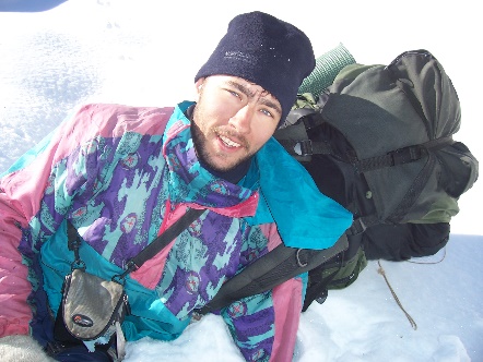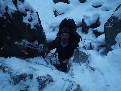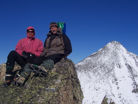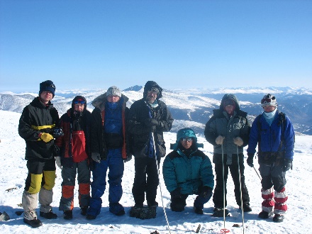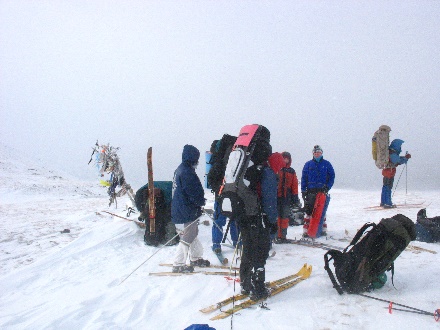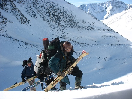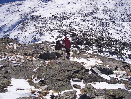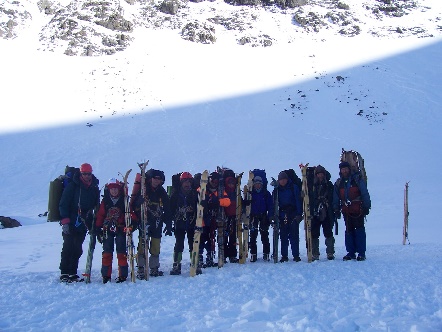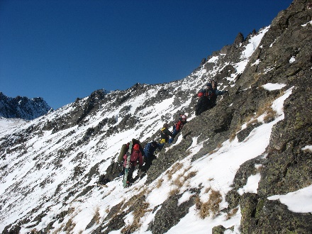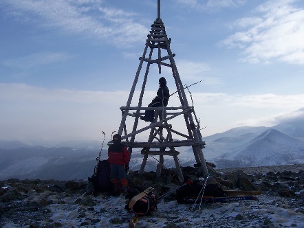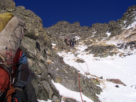 01.03 Выход в 8:20. Разбиваемся на две группы. Одна под руководством П.А.Кормильца уходит на восхождение на вершину 2969,4 м в хребте Сальджур. На лыжах подошли под начало маршрута. По мелкой и средней осыпи плотной группой по кулуару поднялись на предвершинный гребень, пересекли кулуар, начинающийся из-под вершины, и вышли на наклонное плато. Крутизна склона 300-400 мелкая осыпь. 12:10 группа на вершине. Фотографируемся. Видно горы республик Хакасии, Тыва, Горный Алтай. Спускаемся по пути подъёма. В 14:20 вернулись в лагерь. Вторая группа под руководством руководителя Пиманова О.В. взошла на пирамидальную вершину 2605 м на водоразделе с р.Позаек. Выход в 800. Подъем под юго-западный гребень из-за глубокого снега занял полтора часа. На моренных валах ветровой наст, впрочем без лыж почти не держит. В правый по ходу цирк гребень обрывается скальной стеной. Одели кошки. Подъем на плечо над стенкой относительно пологий (250-300). Сначала по средней каменной осыпи, затем, перед плечом, по бараньим лбам с гимнастической страховкой. Небольшой (50м) снежник выводит на плечо, от которого к вершине ведет скальное ребро. Время движения 45 минут. От плеча левый склон становится круче, его прорезают кулуары. Правый наоборот становится положе (до 400-450). Подъем 200 м по гребню, затем 100-150 м по снежнику справа по ходу, придерживаясь гребня, и снова на гребень. Предвершинный взлет круче, гребень острей, используем элементы свободного лазания. Требуется перильная страховка. Уже перед самой вершиной жандарм, который обошли справа по ходу. Подъем от плеча на вершину занял еще 45 минут ходового времени. В 11:00 на вершине. Великолепная панорама. Спуск занял 1 час. В 12:30 в базовом лагере.