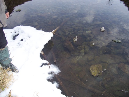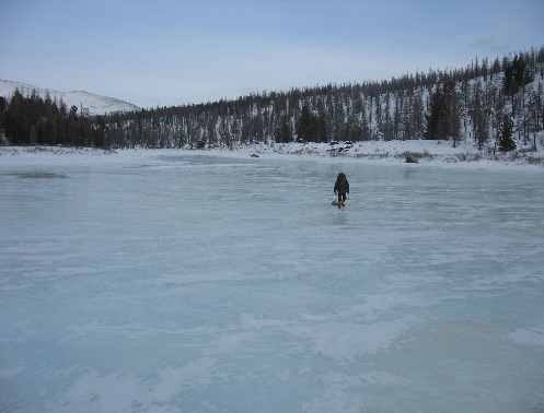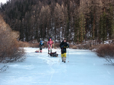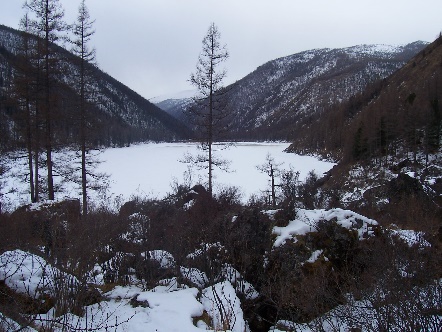 На озере дует сильных ветер, пересекаем озеро за 10 минут. Летом тропа идёт по северо-западному берегу. Выше озера дно долины широкое, поросшее кустарником, явного русла ручья нет. Идём по пойме ручья, по кочкам и наледям, продираясь через кусты. Через 20 минут выходим на русло ручья и идём по наледям, что очень удобно, скорость 5-6 км/ч. Охотничья тропа идёт по левому (орфографически) берегу ручья Кулагаш, хорошо заметная, снега 10-15 см. В 12:00 в 3-х переходах от озера встали на обед на левом берегу ручья, в тихом от ветра месте. Вода из ручья. Выход с обеда в 1320. Через 20 минут дошли до крупного правого притока, а ещё через 20 минут до нашего левого притока. Уходим по тропе по левому берегу, снега 10-15 см. Через 25 минут вышли к маленькой (на одного человека) охотничьей избушки. Лес горелый, заросший молодым листвяком и кустами, много брусники. Встали на ночёвку. 15:05. Температура –8°С.
