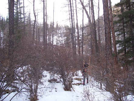 24.02 Выход в 8:00. Идём по правому (орфографически) борту долины реки Харликмес. Не теряем высоты, имеем замысел по-возможности обойти каньон р.Хайрлигмес при впадении в р.Манагы. Снег глубиной 0,6-0,7 м. тропим по 1 и по 2 без рюкзаков. Второй правый приток реки Хайрлигмес дал неприятный каньончик, в нём Ефим сломал лыжу. В 11 часов на переходе долин рек Хайрлигмеса и Манагы встретился каньон с крутыми бортами, завален деревьями и поросший густым подлеском.
