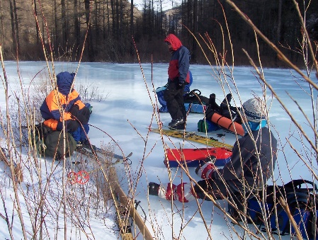 28.02 Температура – 32°С.Выход в 8:20. Погода ясная, морозная. Спускаемся с озера в долину реки Маралы. Снег плотный, застругов нет катание великолепное. Идём по реке Маралы до слияния с рекой Коолаш. На высоком левом берегу на слиянии долин рек встали на обед. 11:30 – 13:10. После обеда поднимаемся вверх по реке Коолаш. Через 1 час хода начинаем постепенно набирать высоту и уходить от реки вправо в направлении перевала Красивый. Выйдя на древнюю морену идём по плотному снегу, без тропёжки, наслаждаясь отличной погодой и великолепными видами. В 15:50 подошли под перевальный взлёт. Перевал Красивый со стороны республика Тыва представляет собой широкую седловину, средняя и мелкая осыпь, наст, крутизна склона 20-25°.определяющая сторона перевала в долину реки Снежная, в республику Хакасия. 16:10 группа на седловине. Одеваем кошки, связываем лыжи и начинаем спуск в сторону реки Снежная. В верней части склона крутизна составляет 35-40°, плотный наст. Уходим влево по средней каменной осыпи с потерей высоты, прорубая ступени или проваливаясь между камней, страхуясь лыжами. Далее спускаемся по борту перевального цирка к озеру. 16:25 на первом озере, пересекаем озеро и спускаемся с морены в кошках на второе озеро. Погода начинает портиться. На третьем озере можно одеть лыжи и обходя скальники и мокрые болотца аккуратно спуститься до зоны леса. На ночёвку встаём в 17:20 на 4-том озере.