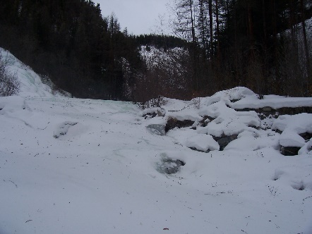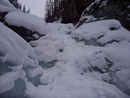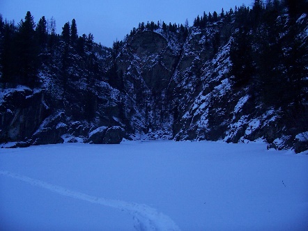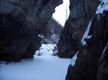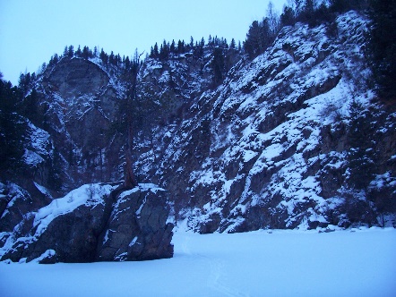 25.02 Выход в 8:00. Идём вверх по реке Манагы. Сразу же попадаем в каньон. Стены каньона высотой до 30 метров, часто с отрицательным уклоном. Два нижних порога в каньоне проходим без лыж и рюкзаков, не сложное лазание, помогаем друг другу. Далее метров 200 идём с рюкзаками, лыжи несём в руках. В каньоне много открытой воды, много ледовых мостов в результате падения уровня воды за зиму. На льду снега 5-10 см. идём по лыжне. Иногда приходится снимать лыжи и перелазить нагромождения камней на порогах и прижимах. В 11:05 дошли до слияния каньонов рек Манагы и Коолаш.