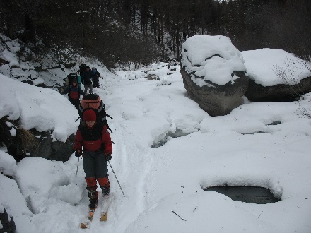 12:10 спускаемся с перевала, первые 100-150 метров проходим без лыж, пересекаем пояс сильно разрушенных скал и уходим по правому борту северного истока р.Курукуль по летней тропе. Глубина снега 20-30 см. Заметна старая лыжня. Скатываемся примерно до середины склона и встаем на обед на удобной стоянке в 12.40. Вода из маленького ручейка, дров достаточно. Учитывая короткую ночь, встаем на ночевку. Группа желающих протропила лыжню на р.Курукуль чуть ниже стрелки истоков. Открывается вид на перевал Кохош. 18.02 Выход в 855.Температура -12°С. Спускаемся к реке по охотничьей тропе, идём без лыж, снега 10-15 см. При движении по реке Курукуль часто встречаются мокрые наледи, заросли кустов и завалы деревьев. В верхней части долина узкая, крутые склоны с горельником и густым подлеском, много поваленных деревьев. По реке идём по летней тропе, лыжи несём в руках. Скорость движения 2,5-3 км/ч. После 3-го притока (все притоки считаем правые) дно долины выполаживается, широкие наледи позволяют двигаться на лыжах довольно быстро. Встречаются завалы и мокрые наледи, в одном из завалов Евгений сломал лыжу, в связи с этим объявлен обеденный привал в 1200, между 4 и 5 (сухим) притоками. Выход с обеда в 1315. Идём местами по реке по наледям, иногда по летней тропе, тропу регулярно чистят охотники. Встретили двух охотников, ходят без лыж лыжи оставляют лыжи под перевалом Курукульским.