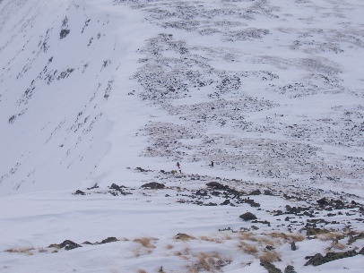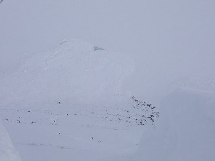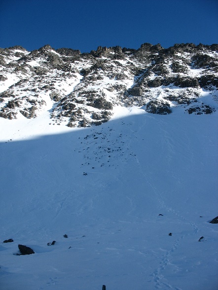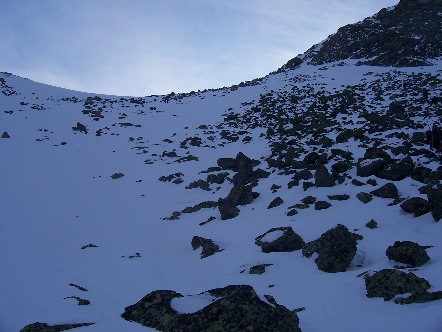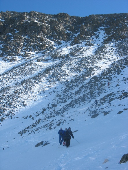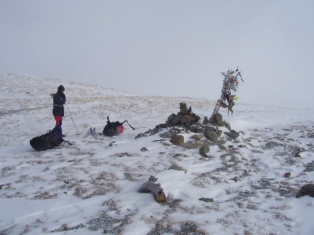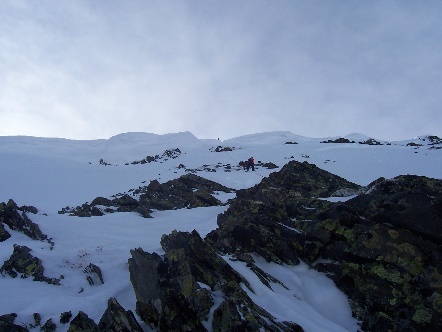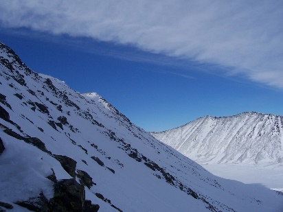 27.02 Выход в 8:00. Ветер. Первый привал под перевальным взлётом перевала Кожагар в 10:00. Одеваем кошки и выходим на правый (по ходу) борт перевального цирка в 10:30. Подъём по протяженным снежным полям с выходами каменной осыпи крутизной до 35°. В 11:50 группа на перевале. Над долиной Маралы висят карнизы. Перевальный тур на этой седловине обнаружить не удалось, на перевале сильно метёт. Поднялись к месту выхода на перевал в 2004 году со стороны р.Маралы в походе 6 к.с. под руководством Пиманова О.В. Тогда путь подъема определил оборвавшийся карниз. Сейчас карнизы были на месте, хотя внизу на озере было достаточно следов от сошедших лавин, вызванных карнизами. Нашли тур. Без записки. Просматривая склон, увидели что меньше всего карниз нависает как раз с седловины, куда вышла группа. Вернулись к остальным, поставили палатку.