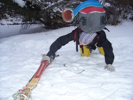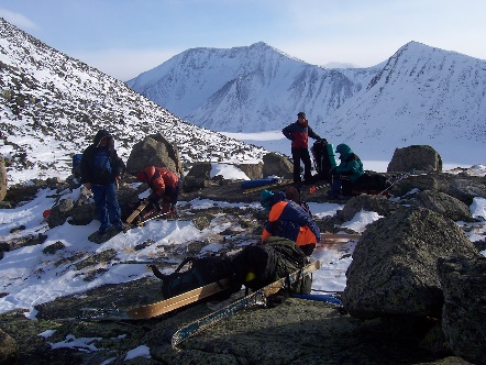 На правом берегу каньона встали на обед в 11:40. Разведка показала. На данной высоте путь по левому борту долины реки Манагы перегораживают выходы скал. Выход с обеда в 12:45. Спустились в каньон реки Харликмес в 13:05. По реке много камней, тесный каньон с отвесным левым берегом, много завалов и заломов, в одном из них Женя Нешин сломал лыжу. 14:00 вышли на реку Манагы. На реке достаточно свежая лыжня группы Вячеслава Попова. В 14:40 встали на стоянку на левом берегу перед входом в каньон реки Манагы на удобной стоянке. Ремонтируем сломанные лыжи.