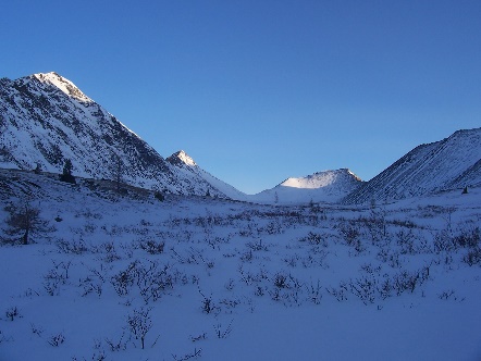 26.02 Выход в 8:15. Идём по наледям, иногда снег на реке глубиной 10 см, тропёжки нет. Со льда реки Манагы очень сложно определить устье реки Мен, поэтому пройдя немного лишнего поднялись на борт долины реки Мен и спустились на широкие наледи реки Мен. Через 20 минут хода по реке начинаем плавный подъём на правый (по ходу) борт долины, что бы срезать угол сократить путь. Склоны долины пологие, поэтому по склону идти легче, чем по реке. Глубина снега 0,6-0,7 м, тропёжка не сложная. На обед встаём в 11:45. Топим снег, варим на горелках. Выходим с обеда в 13:05. С небольшим набором высоты в направлении перевала. Через 1 час 20 минут под одинокой наполовину сухой лиственницей на границе леса встали на ночёвку. Ночёвка напротив слияния среднего и правого истоков реки Мен. Топим снег, дров достаточно, встречаются одинокие деревья. Сложили ветрозащитную стенку вокруг палатки.