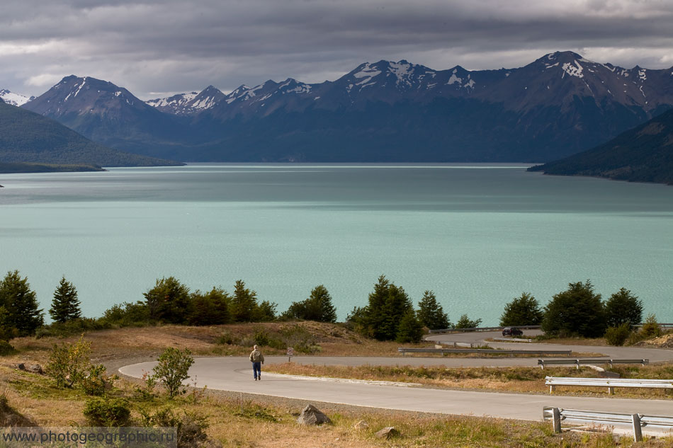 Въезд в зону парковки. Отсюда начинается осмотр знаменитой достопримечательности национального парка Лос Гласиарес - ледника Перито Морено. Осмотр возможен только с хорошо оборудованных площадок и дорожек с перилами. Дорожка, кстати, очень разветвлённая, и в длину, в общей сложности, несколько километров. Не знаю сколько точно. Пол на этой дорожке - это металлическая решётка. Ходить удобно, а вот штатив ставить не очень. Его ноги постоянно проваливаются в дырки.