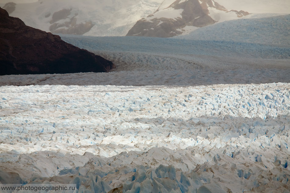 Второго января взяли экскурсию на ледник. Не дёшево, кстати. Это развлечение стоит 100 местных песо, что-то около 25 долларов, на наши деньги. На целый день экскурсии нет. Можно только на полдня. Здесь возможно два варианта. Либо в первой половине дня, либо во второй. Расценил так... В первой половине выезжают не так уж рано и солнце получается совсем уж дневное, то есть слишком высокое. Что не очень хорошо для съёмки. К тому же это была возможность затариться продуктами, в первой половине дня, в местном супермаркете, на дальнейший поход. Ведь первого числа он оказался закрыт. Поэтому выбор пал на вторую половину дня, где была возможность дождаться более низкого солнца ближе к вечеру. Однако на деле не учёл того, что при этом солнце окажется в контражуре, то есть будет пытаться светить прямо в объектив. А совсем уж вечером, оказывается, светило здесь зависает прямо над ледником.