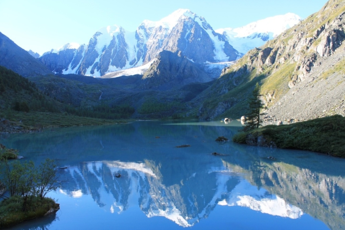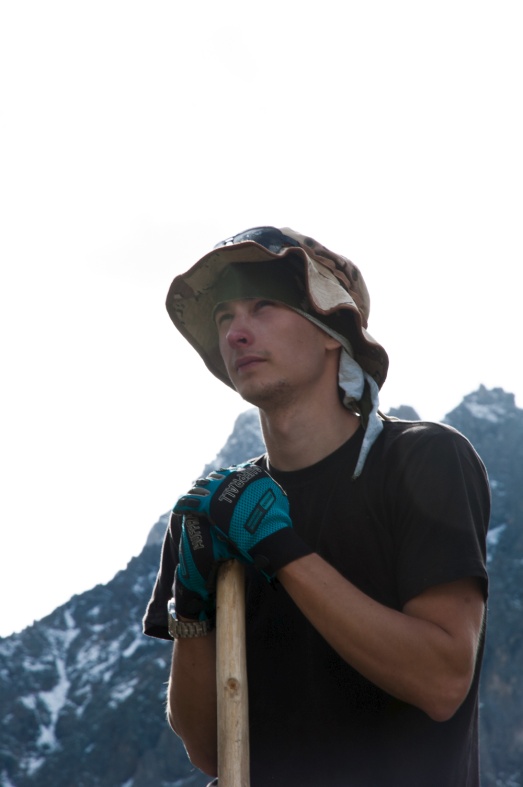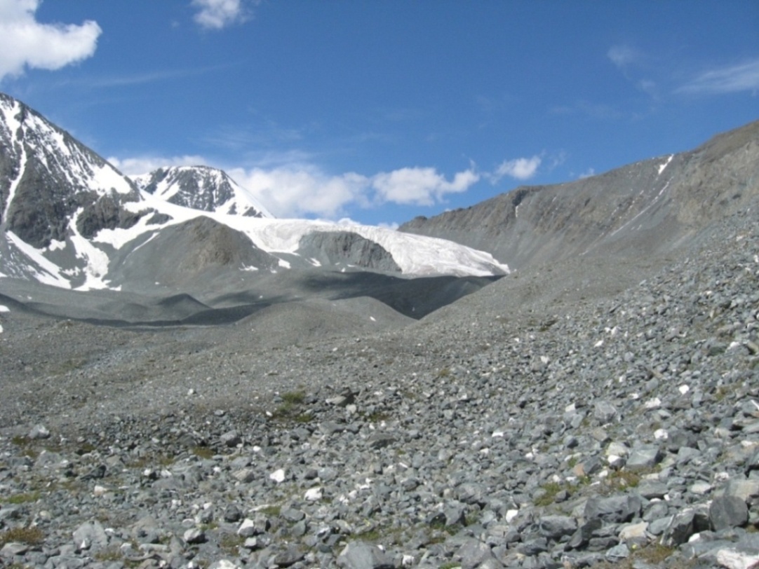 По словам постоянно попадающихся туристов, уже 3 недели подряд каждый день обязательно идет дождь. Нас тоже периодически накрывает, но одежда намокнуть не успевает. Дорога выводит к альплагерю Актру. Здесь куча альпинистов, базируются МЧС-ники, организован даже национальный парк Актру, в связи с этим имеются некие ограничения по рубке леса, проезда и передвижения. Хотя, в соблюдении правил приходится усомниться. Дорога по левому берегу р.Актру переходит в тропу, ведущую к леднику. Единственная сложность на тропе – участок подъема на морену к кромке ледника. Здесь тропа состоит из мелкого гравия крутизной до 30°. У самого ледника на морене ставим лагерь (фото 2). Через наш лагерь проходит популярная тропа, ведущая к Голубому озеру. Озеро образовано за счет моренного вала, находится от лагеря примерно в 2-х км. У озера имеются несколько ровных площадок под палатки и домик гляциологов. В этом месте традиционно останавливаются альпинисты для совершения восхождения на пик Актру. (30 июля) пик Актру (2А, 4044) радиальный выход