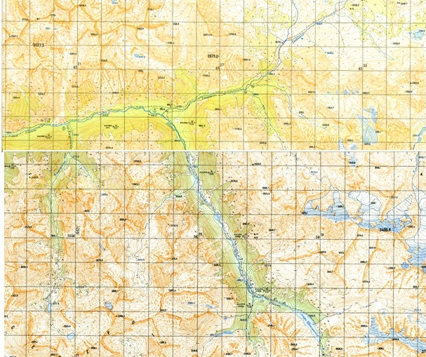 Утром начали движение по дороге вверх по долине р.Карагем. через 20 минут дорога уходит по направлению к Карагемскому перевалу. Выходим ближе к руслу. Еще через 15 минут доходим до р.Иолдоайры. Перешли реку в 100 м выше устья. Брод глубина до 0,8, ширина 8 метров, скорость течения до 3 м/с. На правом берегу р.Иолдоайры почти сразу вышли на урочище Карагемская поляна. Урочище представляет собой огромное плоское поле, отделенное от реки узкой полосой соснового бора. Имеется новая баня с ярко-синей металлочерепичной крышей. Есть старый домик и даже имеется площадка с сеткой для волейбола. Немного пожалели, что вчера не дошли до этого места. Проходим к восточному краю поляны, где начинается тропа ведущая вверх по долине р.Карагем. Первые 3 км тропа ведет по жутким зарослям ивняка, заваленному лесу и болотам. Скорость сильно упала, группа растянулась. Положение усугубляет жаркая погода. Так доходим до р.Лев. Карагем. Брод шириной 30 м, глубина до 0,5 м, скорость течения до 2 м/с. После р.Лев.Карагем тропа поднимается на склон левого борта долины. Идти уже полегче.Тропа иногда ведет по куруму, где отмечена туриками. Первый левый приток проходится по бревну (фото 36). От р.Лев.Карагем до оз.Абыл-Оюк доходим по тропе за 2,5 часа. На северном берегу озера имеются ровные площадки под палатки. Останавливаемся на ночлег. (8 августа) Ледник Абыл-Оюк – пер.Абыл-Оюк (1Б) – р.Шавла – оз.В.Шавлинское