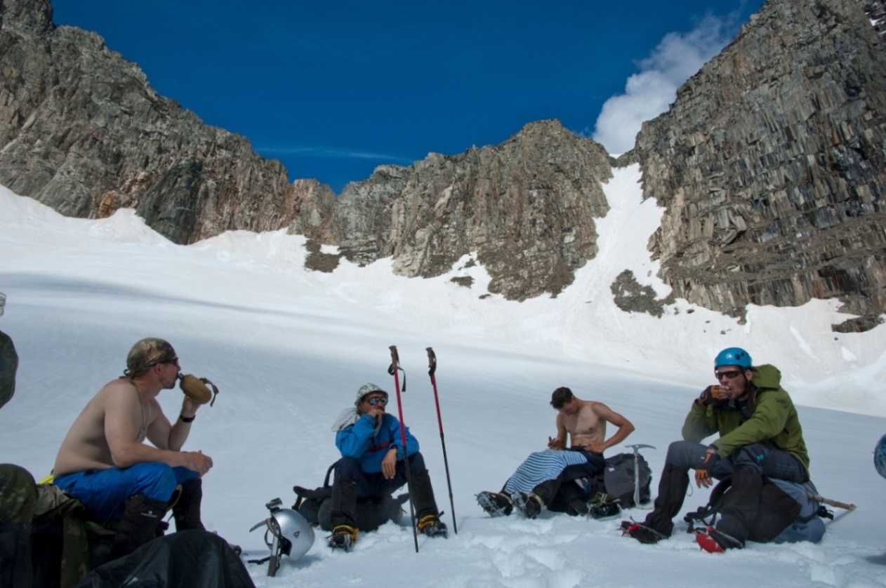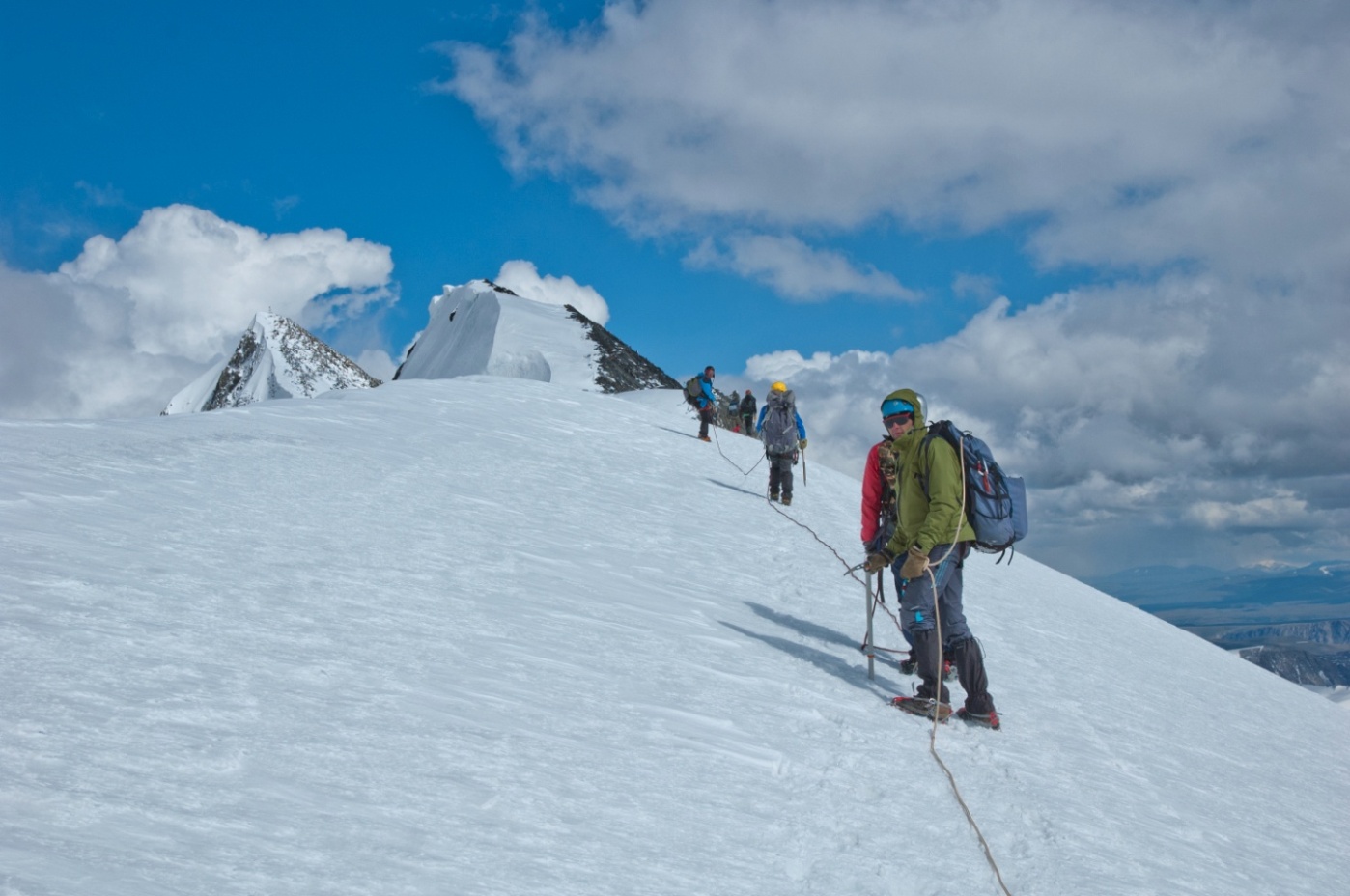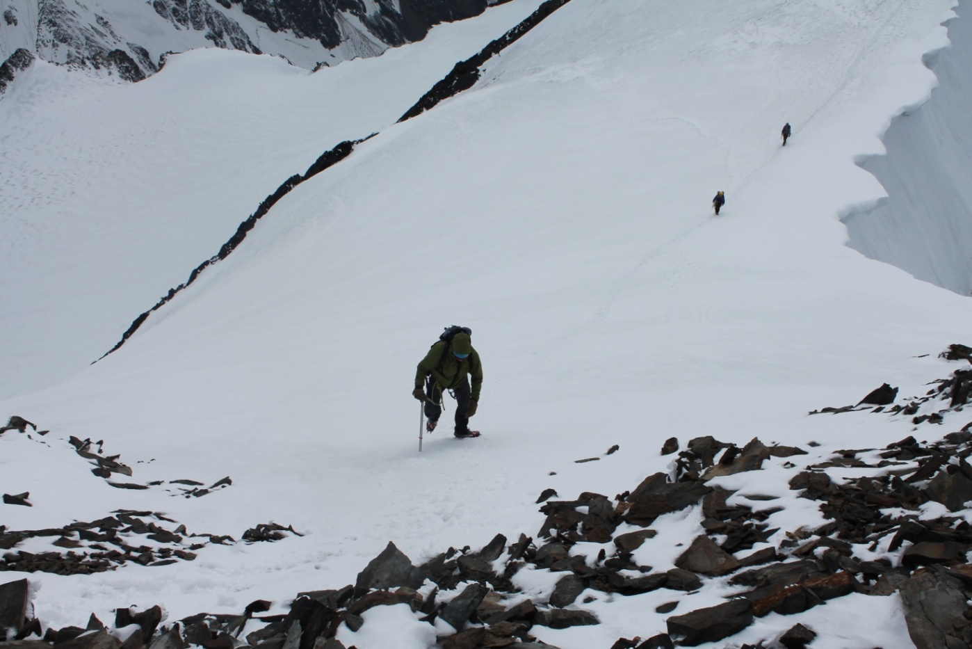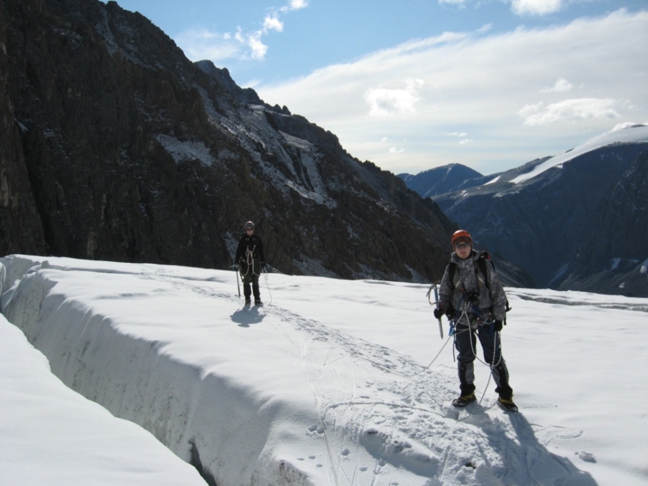 Уже накануне вечером облачность поднялась, а затем растворилась. Стали готовиться к радиальному выходу на пик Актру. Утро не обмануло ожиданий: ясное небо, отличная видимость и боевой настрой. Проснулись в 6 утра, еще в сумерках быстро позавтракали, собрались и в 7 часов вышли на ледник. Нижняя часть языка ледника резко обрывается в долину, но перед обрывом небольшая морена, где и находится наш лагерь. Ледник слегка припорошен снегом, сразу одеваем кошки. Больших трещин в нижней части ледника нет. Через 2 км появились большие трещины, дальше идем в связках по 3 человека (фото 3,4). Скорость сильно снизилась. Пологие участки ледника сменяются ступенями подъема крутизной в некоторых местах до 30°(фото 5). С набором высоты снега на леднике становится больше, местами до 0,3м. Трещин много, большинство заполнены пробками, которые солнце еще не успело растопить. Путь от лагеря до начала подъема на седловину гребня Актру (фото 6) занял 3,5 часа. Подъем на седловину начинается снежным склоном крутизной до 30° (фото 7). Затем склон становится круче, местами до 45°, под тонким слоем снега натечный лед. Навешиваем перила (7 веревок подряд). По причине большого количества участников подъём на седловину занимает 3 часа. Гребень Актру неширокий, в южную сторону обрывается снежными карнизами (фото 8). Двигаемся в связках. На гребне имеется крутой участок (до 35°) около 30 метров, где повесили перила (фото 9). Непосредственно перед вершиной участки плотного твердого льда (фото 10). На вершине пика находится триангуляционная железная вышка (фото11). Сняли записку группы альпинистов под руководством Пугачева А от 13.07.2014г, которые совершили восхождение по маршруту 3А. От выхода на седловину до вершины пика затратили 1 час. Спуск по пути подъёма. На путь от вершины до лагеря потратили 4 часа. В лагерь вернулись уже в сумерках. (31 июля) р.Б.Актру