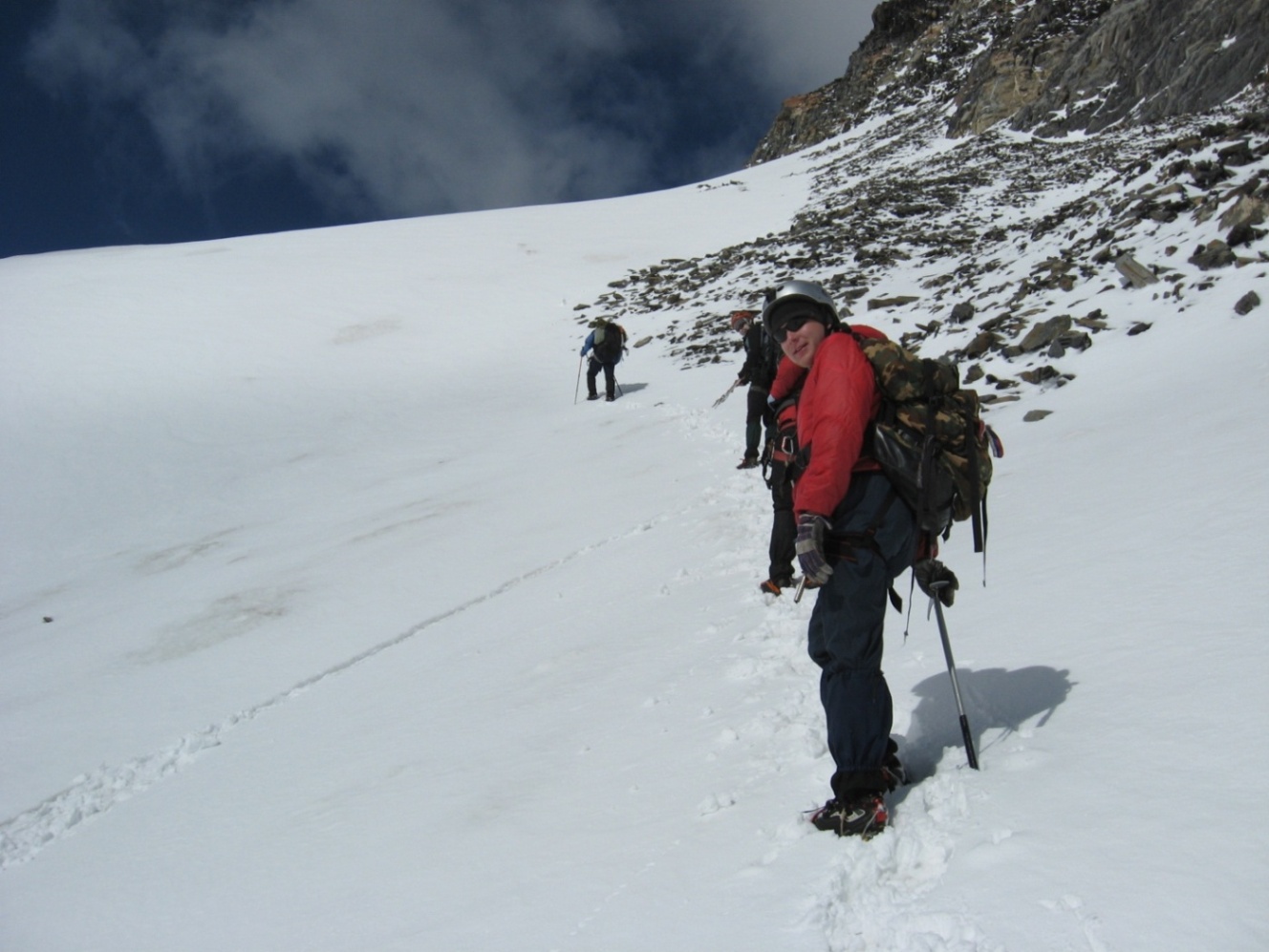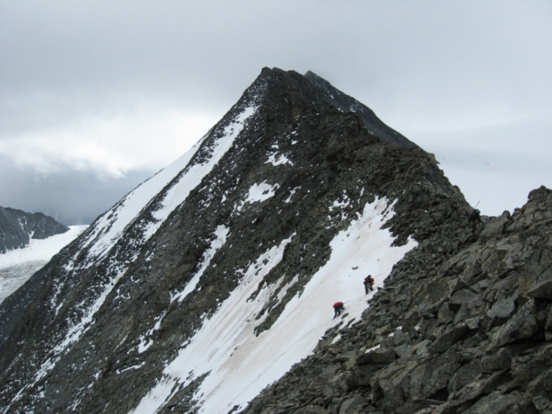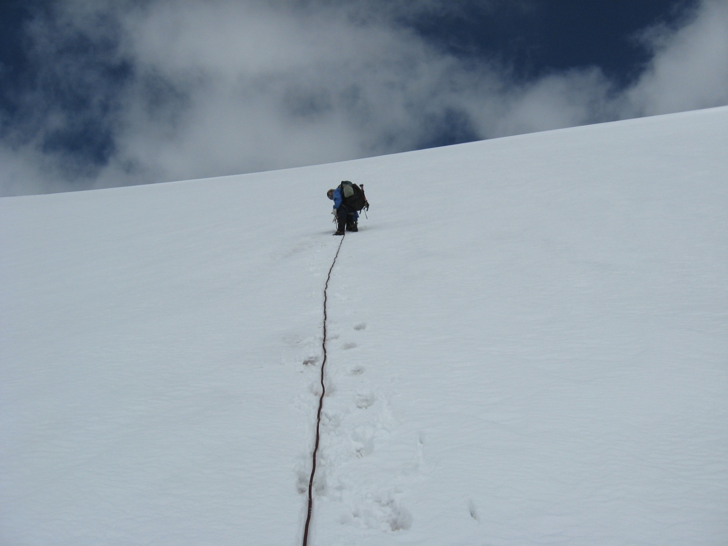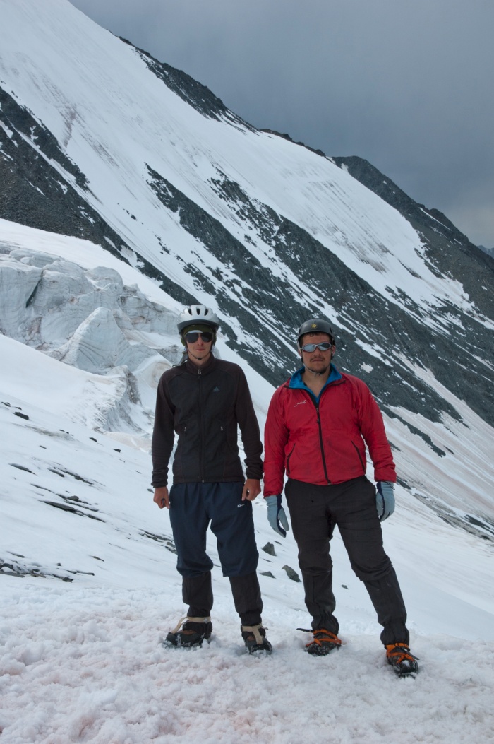 Уже накануне вечером облачность поднялась, а затем растворилась. Стали готовиться к радиальному выходу на пик Актру. Утро не обмануло ожиданий: ясное небо, отличная видимость и боевой настрой. Проснулись в 6 утра, еще в сумерках быстро позавтракали, собрались и в 7 часов вышли на ледник. Нижняя часть языка ледника резко обрывается в долину, но перед обрывом небольшая морена, где и находится наш лагерь. Ледник слегка припорошен снегом, сразу одеваем кошки. Больших трещин в нижней части ледника нет. Через 2 км появились большие трещины, дальше идем в связках по 3 человека (фото 3,4). Скорость сильно снизилась. Пологие участки ледника сменяются ступенями подъема крутизной в некоторых местах до 30°(фото 5). С набором высоты снега на леднике становится больше, местами до 0,3м. Трещин много, большинство заполнены пробками, которые солнце еще не успело растопить. Путь от лагеря до начала подъема на седловину гребня Актру (фото 6) занял 3,5 часа. Подъем на седловину начинается снежным склоном крутизной до 30° (фото 7). Затем склон становится круче, местами до 45°, под тонким слоем снега натечный лед. Навешиваем перила (7 веревок подряд). По причине большого количества участников подъём на седловину занимает 3 часа. Гребень Актру неширокий, в южную сторону обрывается снежными карнизами (фото 8). Двигаемся в связках. На гребне имеется крутой участок (до 35°) около 30 метров, где повесили перила (фото 9). Непосредственно перед вершиной участки плотного твердого льда (фото 10). На вершине пика находится триангуляционная железная вышка (фото11). Сняли записку группы альпинистов под руководством Пугачева А от 13.07.2014г, которые совершили восхождение по маршруту 3А. От выхода на седловину до вершины пика затратили 1 час. Спуск по пути подъёма. На путь от вершины до лагеря потратили 4 часа. В лагерь вернулись уже в сумерках. (31 июля) р.Б.Актру