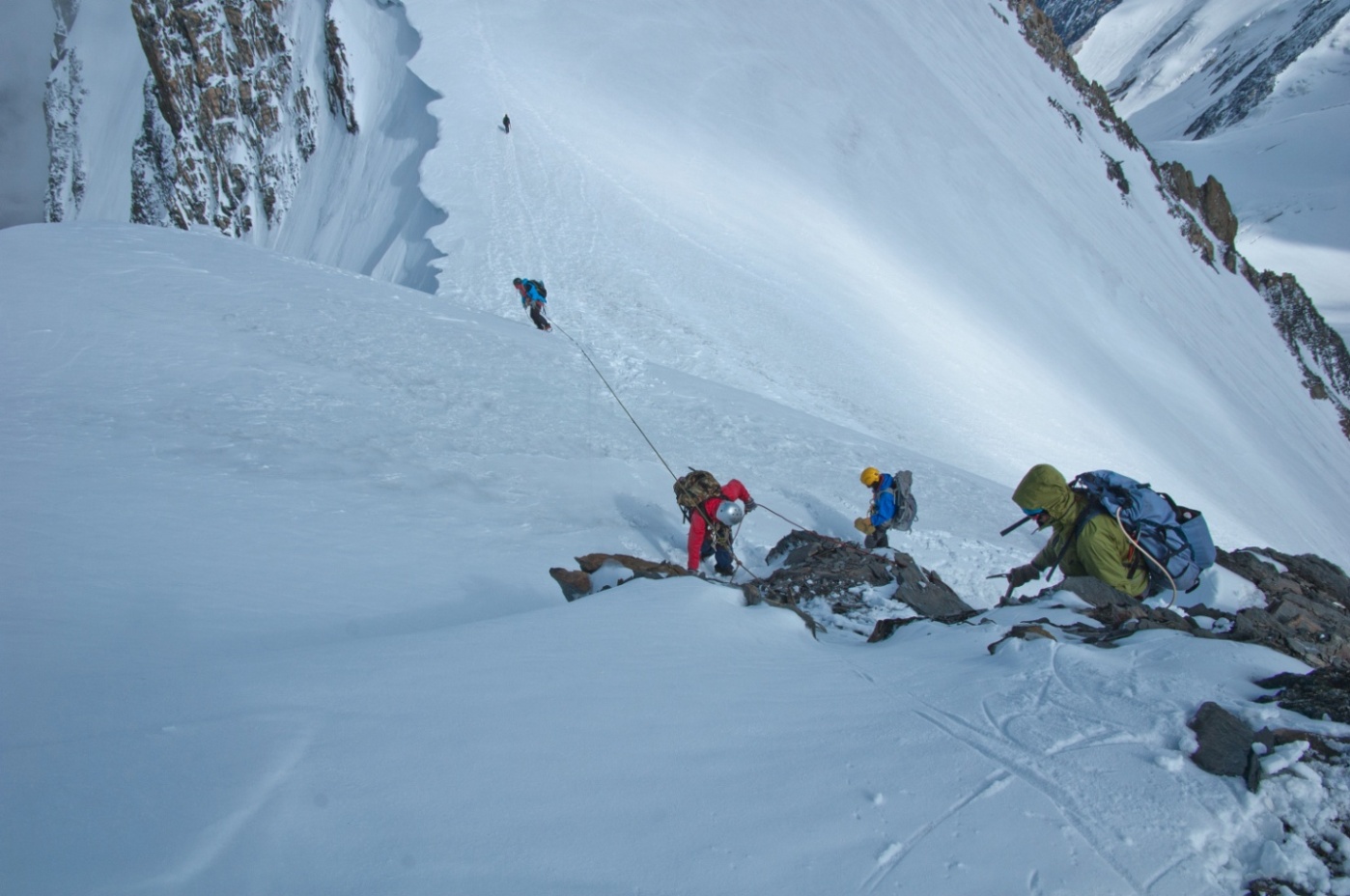 Фото 8 – На гребне продолжаем двигаться в связках, слева снежный карниз