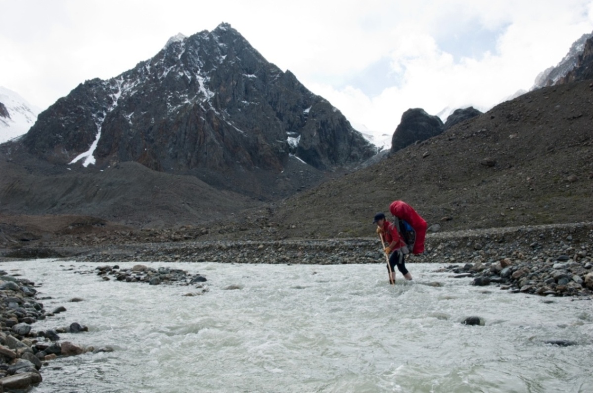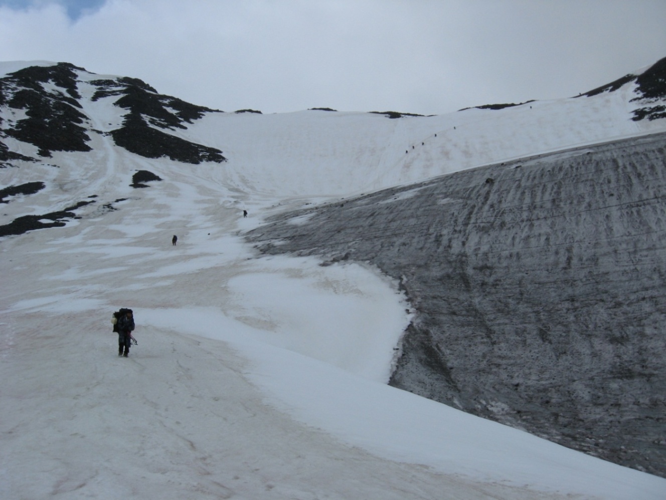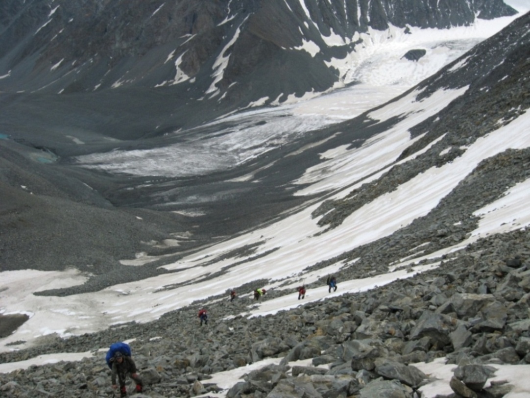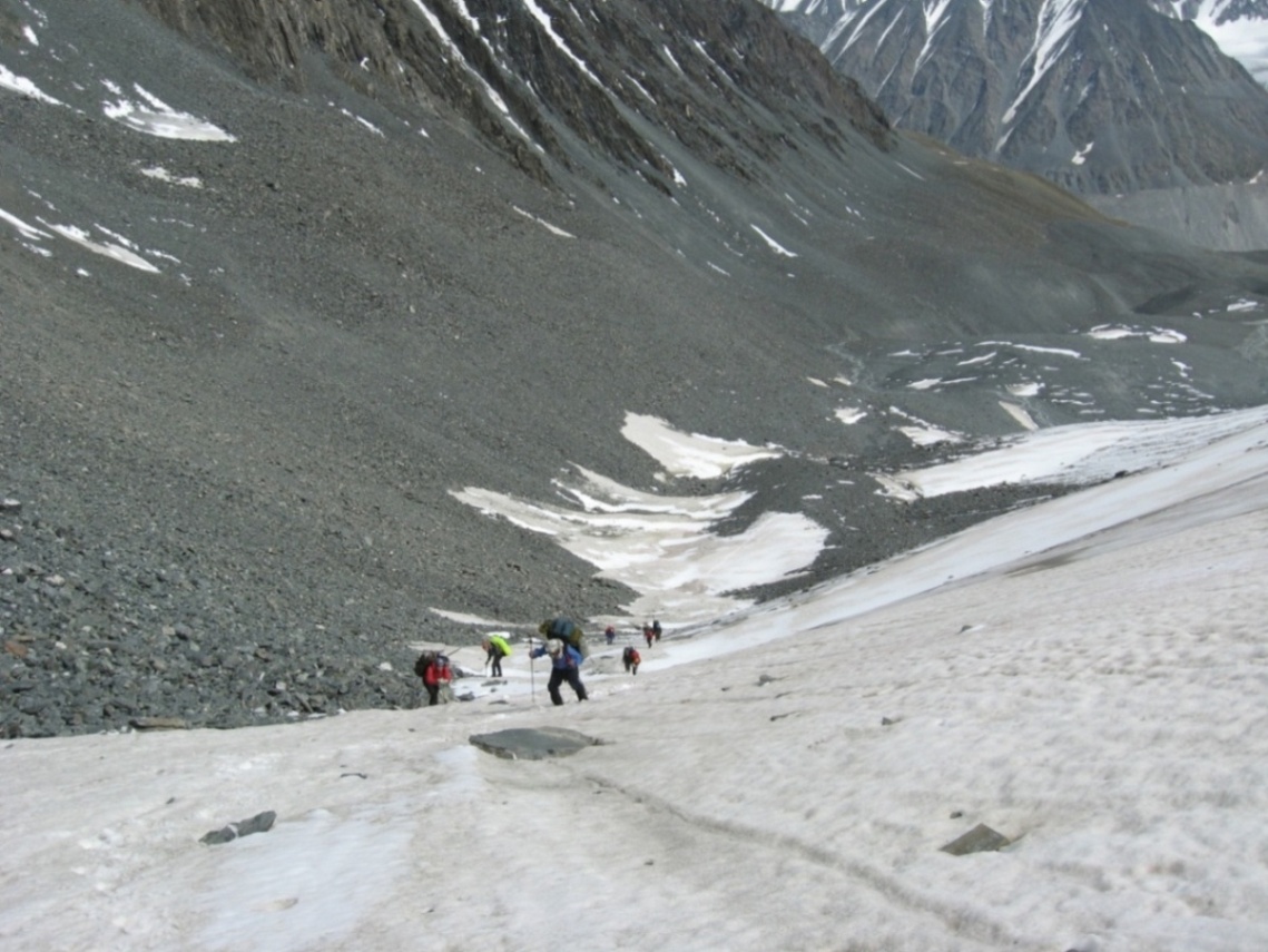Ночью лагерь засыпало снегом, выпало около 10 см. Сегодня решили подойти максимум под перевал Кзылташ. Раннего подъема не получилось, поэтому к моменту выхода (в 12 часов) солнце уже успело растопить большую часть выпавшего снега. Спуск к реке Актру занял 1 час. Река из-за обильно таявших осадков забурлила. Брод ширина 8м, глубина до 0,5 м, скорость течения до 2 м/с (фото 12). Правый берег р.Актру пересекают многочисленные моренные валы, есть ровные площадки для установки лагеря. Можно утсановить палатки непосредственно у ледника Мал.Актру, но неоднократно наблюдая камнепады на правом борту долины решили не рисковать и поставили лагерь на площадке моренного вала в 0,4 км от ледника Мал.Актру. (1 августа) лендикМал.Актру – пер.Кзылташ (2А, 3340)