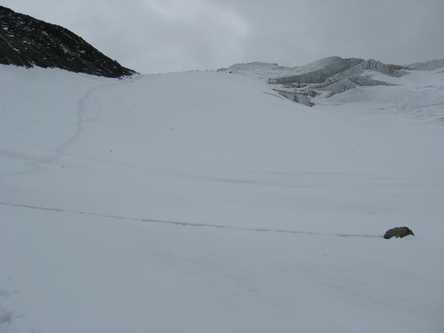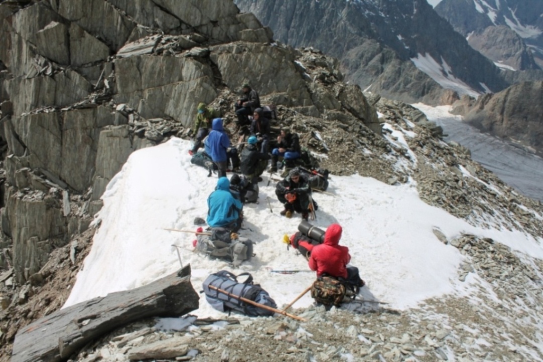 Высокая облачность утром, без намека на ухудшение погоды. За 30 минут доходим по морене до начала ледника мал.Актру. Одеваем снаряжение. Выход на ледник довольно крутой, до 35°(фото 14). В нижней части язык ледника узкий, много каменных полос от камнепадов, рекомендуем двигаться ближе к левому борту ледника. Через 0,3 км ледник ненадолго выполаживается до 10°. Далее начинается мощный ледопад, который также обходится ближе к левому борту распадка (фото 15). Склон достигает в некоторых местах 45 °. В месте где ледник расширяется появляются большие трещины по всей ширине (фото 16). Для преодоления одной из них пришлось навешивать перила. Во второй половине дня началась сильная пурга. Видимость упала до 10 м. Снега выпало до 0,3м. Ровных и лавинобезопасных мест для установки лагеря на леднике нет. Решили двигаться к седловине прижимаясь к правому борту распадка, с предварительной разведкой. Связались в связки по 3 человека. Непосредственно перед седловиной угол склона достигает 45 °, но выпавший свежий снег (глубиной до 0,5 м) держит хорошими ступенями. Дойдя до первой ровной площадки, устанавливаем лагерь. По навигатору мы в 0,4 км от перевальной точки. Лишь утром на следующий день мы увидели, что мы находимся на гребне седловины, в 0,3 км на западе видна изба гляциологов (фото 17). Изба заброшена, окна и двери отсутствуют, по колено снега, для ночевки непригодна. Седловина перевала – самая широкая в гребне. Тур сильно разрушен, построили новый. Для уверенности прошли по гребню на запад, нашли еще тур, записки в туре нет. (2 августа) пер.Кзылташ – прав. Исток р.Тура-Оюк – р.Джело
