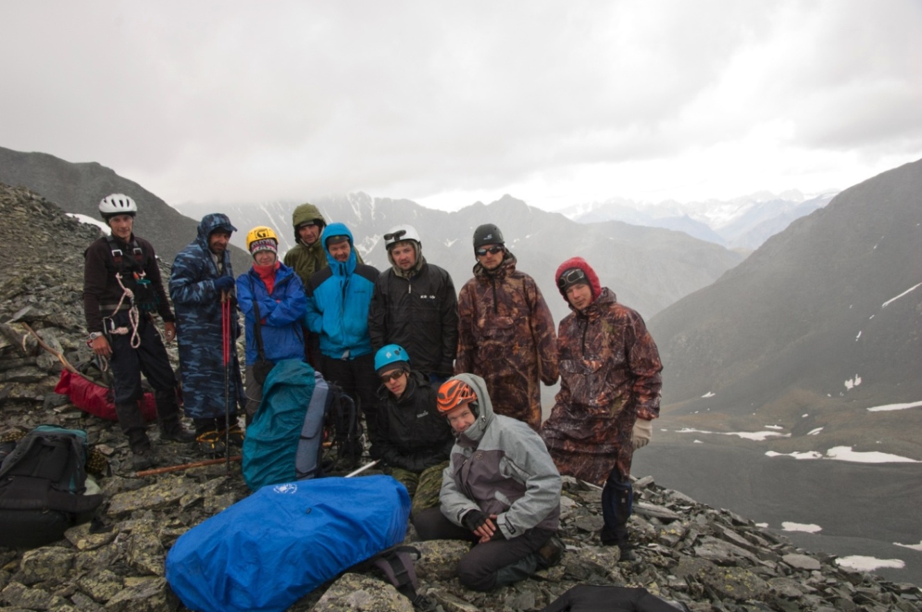 Фото 34 – Группа на перевале Анитим. Слева-направо: Гришаев С., Голубин В., Павлова Т., Борисихин Е., Светлаков Д., Каун Д., Сизов П., Ращупкин А., Кожин К., Кузнецов М. Фотографирует Ворожцов А.