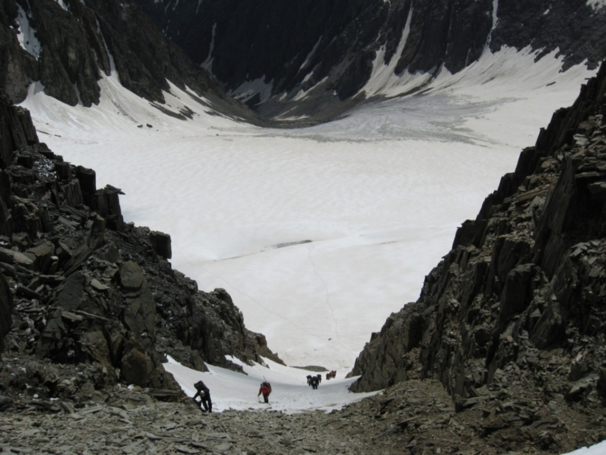 От озера Абыл-Оюк по тропе за 1 час доходим до ледника. Непосредственно у ледника много ровных площадок под палатки. Крутое начало ледника (до 25°) выводит на пологую часть (фото 37). Ледник закрытый, но больших трещин не видно. По леднику за 40 мин доходим до начала подъема на перевал (фото 38). Подъем на перевал проходит по кулуару крутизной до (35°). В кулуаре лежит снег. За 50 метров до перевальной точки очень мелкая осыпь (фото 39). Идти по ней лучше в кошках. Доперевальной точки поднялись за 40 минут. Седловина узкая (фото 40). Сняли записку группы из Нижнего Тагила под руководством В.Гомана от 08.08.2014г. Спуск с перевала начинается относительно широким, но крутым (до 40°) кулуаром (фото 41). Дно кулуара покрыто мелким гравием, затем участками плотного льда. Необходимо двигаться в кошках. В начале спуска слева ПХД на камне есть петля от предыдущих групп. Спускались плотной группой. Крутая часть продолжается около 100 м, затем выводит на осыпь с участками снежника крутизной до (35°), которая в свою очередь выводит на ледник. Ледник пологий, полностью открытый. До ледника спускаемся за 50 мин. На леднике нас застал сильный дождь, пережидаем под тентом. На выходе с ледника поймали тропу. Тропа довольно экстремальная, ведет по крутым склонам, осыпям и грязи размокшей после дождя. Особенно опасен спуск к оз.В.Шавлинкому. Около 300 м тропы проходит по склону крутизной до (40°). Тропа в некоторых местах выбита ступеньками. Грязь скользкая, необходимо быть максимально аккуратными. Озеро В.Шавлинское начинает восстанавливаться (фото 42). Но береговая линия совсем не соответствует карте. Недоходя озера 200 м остановились на ночлег. (9 августа) Р.Шавла – оз.Н.Шавлинское