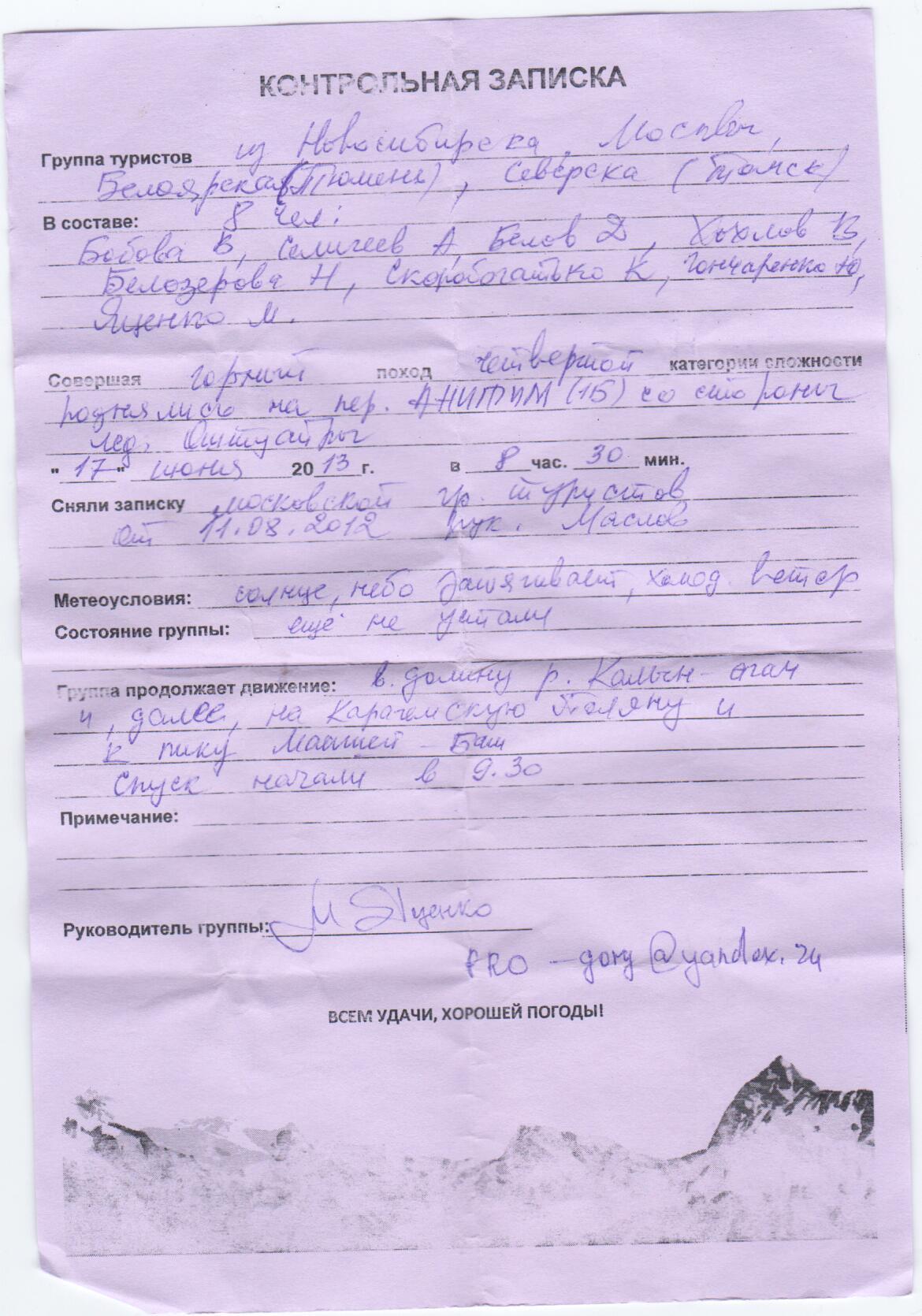 Уставшие москвичи решили пропустить нас вперед. До начала крутой части подъема доходим по средней осыпи крутизной до 20° за 1 час. Дальше одеваем кошки. Подъем осуществляем по центральному кулуару. Разделяемся на 2 группы, так как далее около 100м крутой (до 35°) очень подвижной средней осыпи (фото 30). По осыпи выходим на крутой (до 45°) снежник, который выводит на перевальный гребень (фото 31). Подъем по крутой части занял 1,5 часа. Тур находится немного севернее перевальной точки (фото 32). Сняли записку группы под руководством Мамонтова П.Г. от 06.05.2014 г. От тура просматривается тропа, которая идет по левому краю распадка. По тропе, возможно, подъем был бы немного легче. Спуск с перевала на ледник Оштуайры начинается с 6-метрового скального отвеса, но чуть южнее тура есть довольно крутой, но проходимый спуск по осыпи. Немного пройдя по леднику, упираемся в ледовый сброс (фото 33). Начался сильный снег, пережидали под тентом 1 час. Снега выпало 20-30 см, закрыло все трещины. Решили не искать обход сброса, а организовать спуск. Отвесная часть (около 6 м) выводит на крутой (до 35°) ледовый склон протяженностью 100м. Из-за перегиба команд не слышно, поэтому договорились начинать спуск по истечению 3х минут после снятия нагрузки с веревки. Сброс преодолевали 2 часа. Группа москвичей уже давно нас догнали и мерзли, ожидая своей очереди. Перевал Анитим имеет 2 седловины одинаковые по технической сложности и на подъем и на спуск. Выбираем восточную (ближнюю к нам) седловину для прохождения. Разделяемся на подъеме на 2 группы (часть группы еще проходит ледовый сброс). Подъем на перевал Анитим – средняя, очень подвижная осыпь крутизной до 35° около 300м. Осыпь чередуется скальными выходами. Поднимаемся рассредоточенной группой. Подъем занимает 50 мин. Седловина перевала не широкая Фото 34). Сняли 2 записки: сборной группы под руководством Яценко М. от 17.06.2013г. и группы туристов из г.Пермь под руководством Деменева Н. от 05.03.2014г. Путь спуска полностью просматривается. Спуск по снежно ледовому склону крутизной до 35° (фото 35). Спускаемся, подрезая склон в восточном направлении с индивидуальной страховкой. Снег местами глубиной до 0,8 м. до пологой части ледника спускаемся за 40 мин. Путь до первой «зеленки» занимает 1 час. Останавливаемся на ночлег. (6 августа) р.Калынагач – р.Карагем