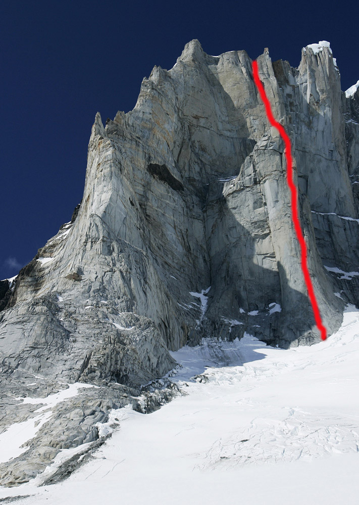 Years ago, a picture of Cerro Murallтn, an almost unknown mountain even among expedition climbers, had captivated Robert and me. On this photograph, a huge, mostly overhanging pillar soared up some 600 meters, followed by a ridge leading to a 400 meter high section of rock rearing up like a gigantic, breaking wave. The perfect line was of unsurpassable simplicity and beauty. Our appetites were additionally wetted by the words of the great Italian Patagonia climber Casimiro Ferrari, who wrote about Cerro Murallтn: “If Cerro Torre is the mountain that left its deepest mark on me and if Fitz Roy was the technically hardest, then Murallтn was the peak that put my mental and physical powers to the toughest test.” What kind of mountain must it be to make the great Casimiro Ferrari pay such obeisance? It took him four expeditions between 1979 und 1984 to first reconnoiter an approach to Murallon and subsequently to climb the colossal northeast pillar. He started out with many helpers and in the end, reached the summit with only Paolo Vitali and Carlo Alde. Prior to Casimiro Ferrari, only one expedition had been successful on this peak. It was the untiring Briton Eric Shipton who, together with his partner Jack Ewer and the two Chileans Eduardo Garcia und Cedomir Marangunic, reached the summit plateau in January 1961. Their route from the northwest is perhaps the easiest line. However, the weather conditions were so terrible, that it remains uncertain if the team really climbed the highest ice mushroom. So the first ascent of Cerro Murallтns remains a question. To Robert and me, these details were unimportant. The Murallтn summit is formed by a one-kilometer long plateau with small, technically easy protuberances. Therefore, Robert and I consider Shipton and his team to be the first ascentionists of Cerro Murallуn. An Excurse on Discovery In many cases, remarks and recounts of older climbers are the impulses that make the younger generation take up a challenge. I believe that at the cutting edge of alpinism in the years to come, the sole aim will not be to go higher, faster and harder than the others. The quality of an expedition is not measured by its spectacular aspects, but by the creativity regarding the choice of approach and the goal. There is still a lot of new ground to be discovered in alpinistically undeveloped regions that are just waiting to be found. Their special attraction is that they are hard to reach. Robert’s und my generation and even more so, the younger climbers, will again become discoverers. All of the well-known worthwhile mountains like Trango Tower or Cerro Fitz Roy have been or will soon be developed. But beyond the horizon there still are walls and peaks that have never been photographed or described – some are still mere phantoms of the imagination. These visionary goals are there to be discovered through setting out for the unknown in search of our dream route. Obviously, one could take the easy way and be flown in by a chartered airplane or a chopper. However, that would kill the expedition spirit – the specter of uncertainty and adventure. For me the logical development of modern expedition climbing lies in the adoption of a “by fair means philosophy” – the conscious renunciation of as many artificial aids as possible during the approach and on the mountain – as well as in the attempt to climb the most remote walls of this world. The New Goal When we first started to study the geographic position of Cerro Murallтn with its cumbersome approach and almost insurmountable logistic problems, Robert and I began burning with enthusiasm for this gigantic lump of rock and ice at the end of the world. Cerro Murallтn – also called the “forgotten wall” in Patagonia – rises into the sky to the south of Fitz Roy and Cerro Torre like a huge fortress. With 2831 meters, its elevation by no means marks a superlative. However, the technical difficulties and the remoteness of our pillar make it quite a challenge. To penetrate into this desolate wilderness is an adventure in itself. For this reason, the mountain will never be a magnet for the mass public like the neighboring Fitz Roy or Cerro Torre. None of us had any illusions about the spiteful weather and winds. Back in 1994, Robert had set a record on Cerro Torre with an ascent of the peak in sixteen hours from base camp. Some years before, I had received my baptism by fire – or, more correctly, by ice – during the filming of Werner Herzog’s movie “Cerro Torre: scream of stone”. We knew we would find heaven on earth, which, however, could at any moment turn into hell. We had been warned and expected the worst. But what we got was much, much worse. 2003 – The First Attempt The shortest distance from the last outpost of civilization – the Estancia Christina – to Murallon is 40 kilometers as the crow flies. It took me, Robert, our cameraman Sebastian and Klaus the photographer almost three weeks to carry our equipment and provisions through pathless terrain and dangerous glaciers to the foot of our wall. Filled with awe, we stood under our pillar. Robert and I realized that our equipment and – most of all – the remaining time, would never suffice to reach the summit via the planned route. We both silently pledged that we would come again. In spite of everything, we managed to pluck a very nice first ascent at the right edge of the north face. It also was a 1000-meter high pillar graded 5.10+/M8, that we were able climb in alpine style with Klaus. We called this route “The Lost World” and deposited most of the gear at the foot of our original goal for another attempt the following year. 2004 – The Second Try This time we planned to reach our mountain from the north via the ice cap. The approach was double the distance of last year’s, but we only had to do equipment carries from Piedra del Fraile up to the Passo Marconi. From here, we pulled our belongings over the ice cap 