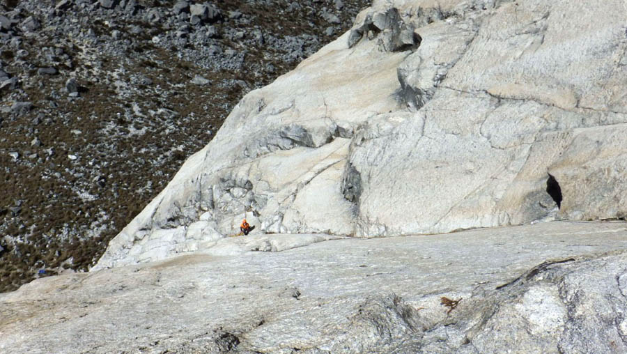 На следующий день мы провели разведку подхода и осмотр маршрута. Подойдя к основанию вершины, мы прошли две верёвки, чтобы выяснить характер маршрута, и оставили заброску.