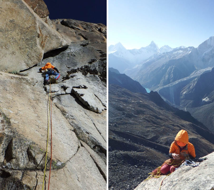 Я приняла лидерство на восходе солнца, когда стало значительно теплее, но не настолько, чтобы снять пуховые курки нашего спонсора (YETI). Прошла классические 5 питчей, сложностью до 6Б, в том числе два ключевых питча с крючьями А1. В это время солнце зашло за стену и стало очень холодно. Я потеряла чувствительность в руках и ногах, любое продвижение вверх вызывало нестерпимую боль. Пришлось вынуть химическую грелку для того, чтобы согреться.