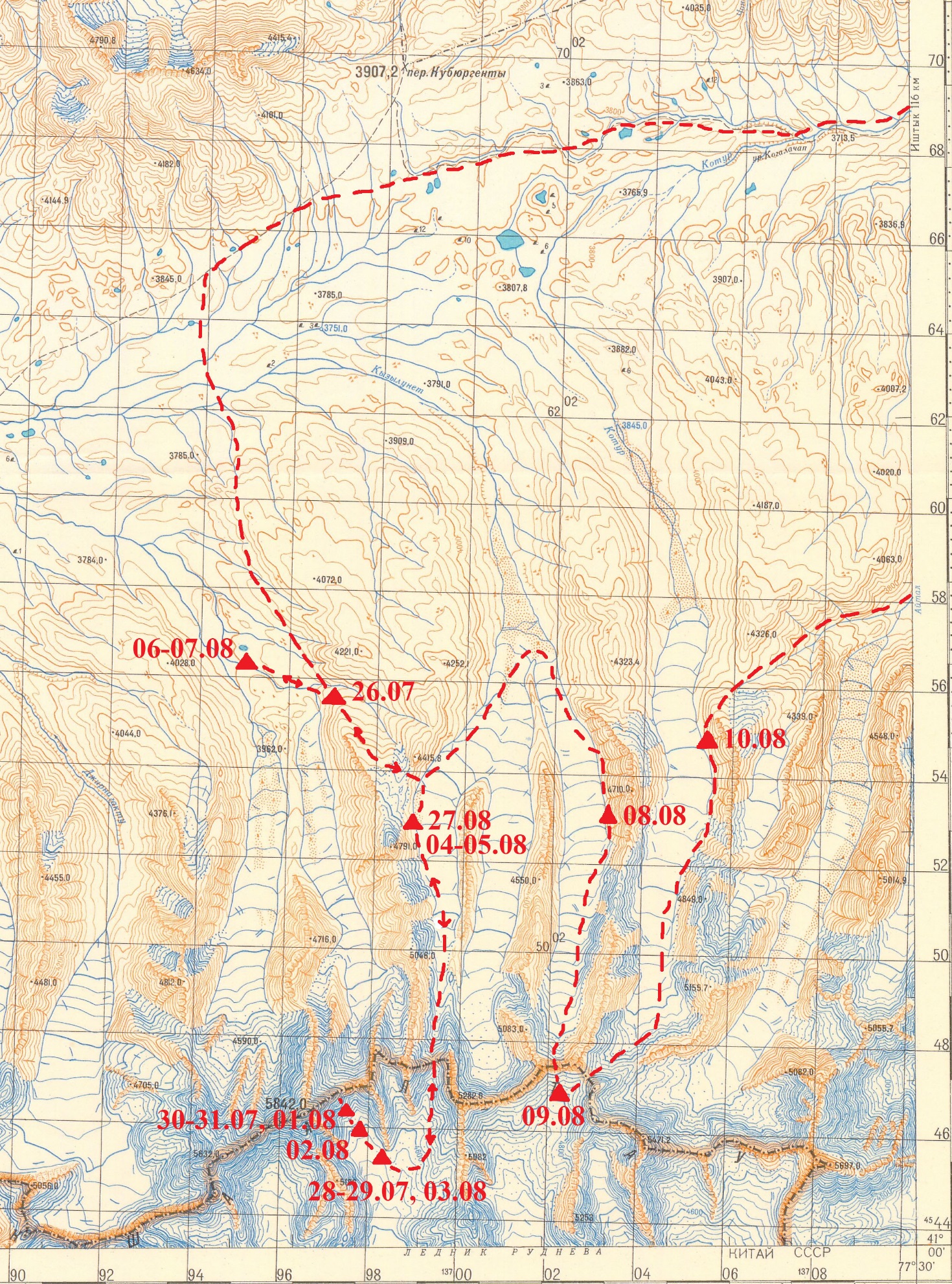 Выводы и рекомендации: Пер. Айтали, простейший и кратчайший путь из урочища Джурек на лед. Котур (Мушкетова). Перевал соответствует 1А к. тр., весьма безопасен, ориентировка не затруднена. Вторая часть похода, после выхода к заброске в урочище Джурек, должна была включать в себя траверс п. Шмидта и прохождение восточного плеча п. Данкова. Однако, по описанным выше причинам, от п. Шмидта пришлось отказаться совсем, да и времени оставалось только на плечо п. Данкова, и то едва-едва. Поэтому, отдохнув день в урочище Джурек (это низшая точка за 20 дней похода, 3380 (!)), группа выдвинулась сразу в направлении лед. Григорьева. Река Айтали без труда проходима вброд, но только не в период паводка и в первой половине дня. В районе урочища Джурек река не слишком бурная, есть несколько мест, позволяющих перебродить без особых усилий. Мы переходили «стенкой», двумя годами ранее, в 2014 г., поодиночке. Выше слияния рек Айтали и Узенгигуш, левым берегом последней, либо травянистой террасой, или по пойме, дойти до реки, вытекающей из лед. Пальгова, 1 – 1.5 ч. Поток несильный, без труда бродится в одиночку. Далее по пойме левого берега р. Узенгигуш до конечных морен лед. Григорьева, 1 ч. Отсюда уже виден правый приток ледника, в верховьях которого находится выход на восточное плечо п. Данкова (Фото 57). В складках конечной морены прячется живописное озеро, хорошее место для отдыха (Фото 58). Сам ледник сильно отступил, и приходится долго, более 1 ч, идти по отвалам левобережной морены до выхода на зачехленный ледник (Фото 59). Далее следует по возможности пересечь ледник на правый борт и подняться в правобережный карман ледника (Фото 60). Здесь, на впадении правого притока лед. Григорьева хорошие места для бивака. Напротив возвышается п. Шмидта (Космос, 5940), вторая вершина района, с еще непокоренной южной вершиной, которая практически не уступает по высоте главной, узловой (Фото 61). Приводим трек нашего движения от урочища Джурек до впадения правого притока лед. Григорьева (Фото 62). Разведка восточного плеча п. Данкова с севера до высоты 5300 (первопрохождение)