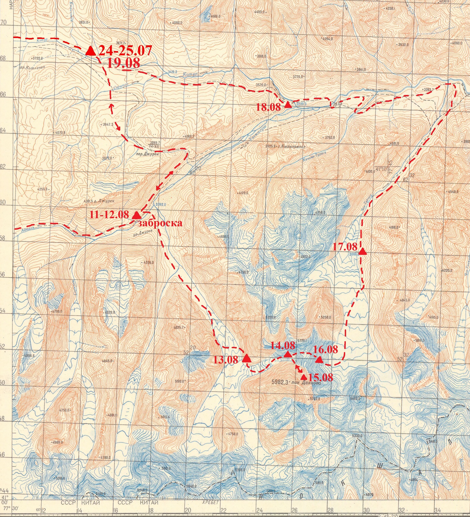 Участники Федосеев Ю. В. и Конилов Д. А. сошли в начале маршрута по болезни, на плато Кагалячап. Географическая и туристская характеристика района Хребет Кокшаал-тоо наиболее высокий хребет Тянь-Шаня и, одновременно, самый южный, отделяющий всю горную систему от пустыни Такла-Макан. При этом Кокшаал-тоо не является водораздельным, реки, текущие с его северных ледников, прорываются через хребет в Китай и теряются в песках вышеупомянутой пустыни. Возможно, вышеперечисленными факторами объясняется неустойчивая погода в районе. Не останавливаясь подробно на чисто географических аспектах (они в достаточной степени изложены в отчетах предыдущих путешественников), хотелось бы подчеркнуть некоторые особенности, имеющие значение для организации туристических и альпинистских мероприятий в районе. В данном случае, описание будет касаться именно западной части Кокшаал-тоо, в зоне ее наибольшего поднятия, от пика Данкова (5982) до пика Кызыл-Аскер (5842). Район труднодоступный, далекий. Дороги отвратительного качества. Много смытых и невосстановленных мостов. Будьте готовы к тому, что заезд в нужную точку может не состоятся. Район холодный и, вместе с тем, достаточно сухой. Однако 2016 г выдался необычайно дождливым (внизу) и снежным (вверху). Многие места, традиционно с травой и камнями, были засыпаны полуметровым слоем снега, который лежал по нескольку дней. Выше 4500 м наблюдался сухой зимний снег. Майка с короткими рукавами, возможно, лишний предмет вашего гардероба здесь. Однако, при этом обводнились многочисленные саи по берегам многоводных рек, обычно пересохшие. В обычный год, найти чистый ручей для бивака проблема. Район дикий и безлюдный, в долинах пасутся многочисленные стада снежных баранов (Марко Поло), по хребтам встречаются стада козерогов. Автономия здесь куда как больше, чем в районе ледников С. и Ю. Иныльчек. При этом, несмотря на более скромные размеры ледников, общий масштаб гор сохраняется. Тропы практически отсутствуют. По долинам рек Узенгигуш (с востока) и Аксай (с запада) сохранились остатки бывших пограничных дорог, по ним возможен заезд в район. Однако, в 2016 г из-за сильных ливней восточный вариант заезда отсутствовал, можно было заехать только на плато Кагалячап с запада. Район высокий, минимальные высоты, даже в долинах рек превышают 3000 м. Район по-прежнему мало освоен в туристском отношении. Некоторые описания, сделанные предыдущими группами, устарели. Вместе с тем, район чрезвычайно интересен, красив, и совершенно не похож ни на какой другой район Тянь-Шаня. На протяжении 50-70 км, от пика Данкова до пика Кызыл-Аскер, горы совершенно меняют свой характер, от пропиленных глубоких ущелий и каньонов до гранитных исполинов, вырастающих прямо на травянистом плато. Подъезды и подходы, связь. Заезд в район возможен двумя путями, с запада, через г. Нарын и далее на плато Кагалячап через заставу Кашкасу, и с востока, через погранзаставы Карасай (к северу от хр. Борколдой) и Узенгегуш, новую заставу, находящуюся чуть выше устья р. Кичи-Узенгегуш. Мы воспользовались первым вариантом, через местных охотников (фирма «Профи Хант»), строящих базу в верховьях р. Котур, выше ее каньонного участка. Через них же заказывали и необходимые для посещения района пограничные пропуска. Второй вариант заезда, с востока, через Узенгигуш был в 2016 г. размыт и 