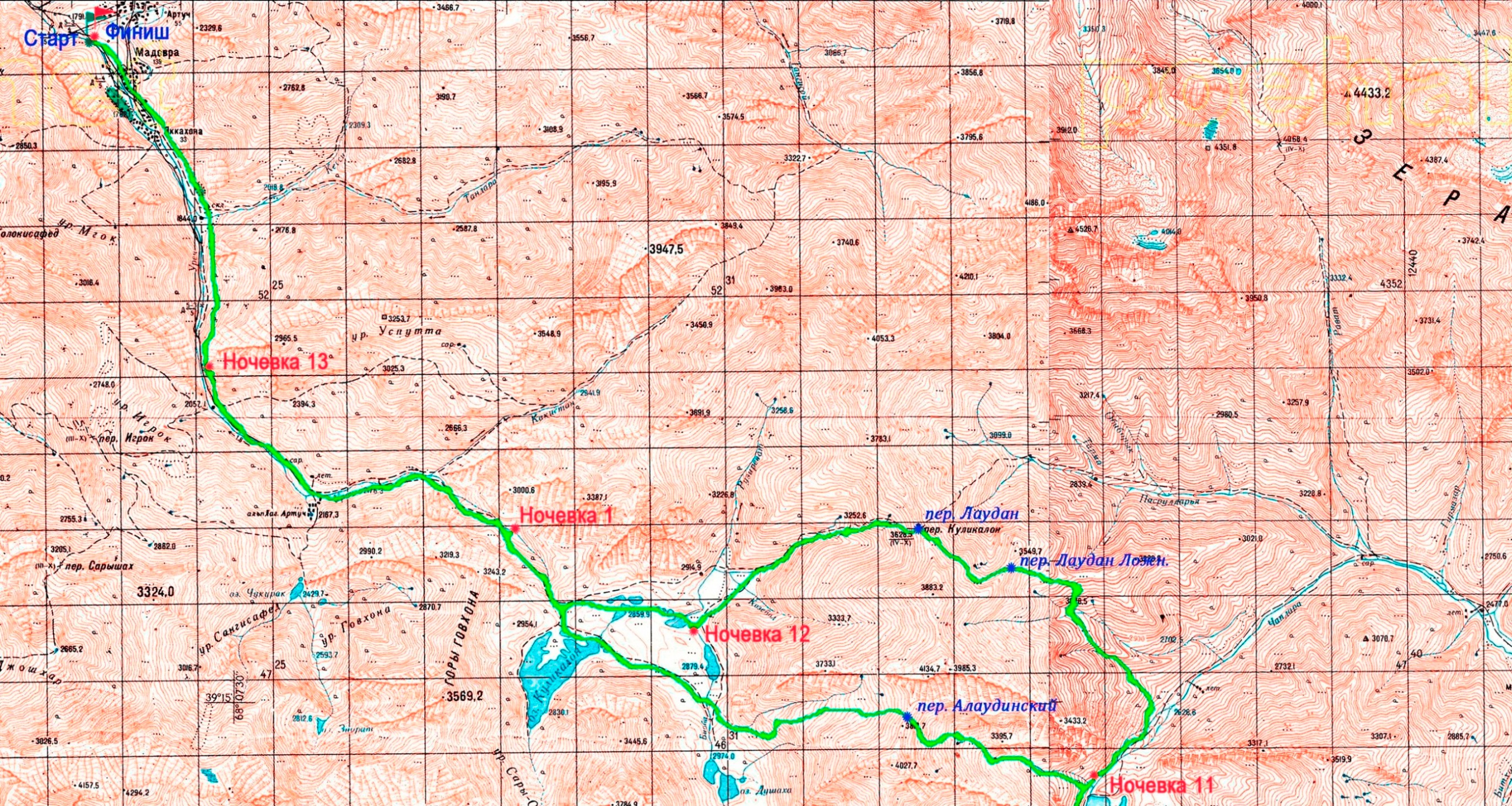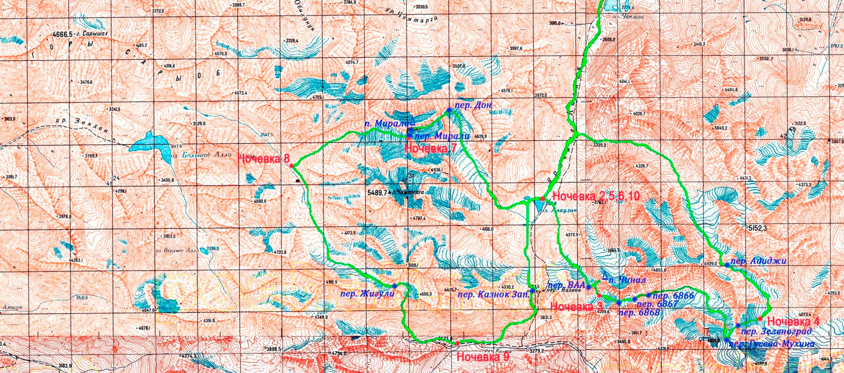 Подробная нитка маршрута Заявленный маршрут Алаудинские озера – пер. Чапдара (1А, 3430, радиально) – Мутные озера – связка перевалов 1Б (ВАА, 4131м + 6868, 4285м + 6867, 4297м + 6866, 4214м) – лед. Мал.Ганза - связка перевалов 2А (Гусева-Мухина Западный, 4700м + Кальгаспорный, 4650м + Седло Ганзы, 4400м) – пер. Фанская сказка (3А, 4300м) – р.Имат – лед. Сухроб – пер. Адиджи (3А, 4400м) – Мутные озера - связка перевалов 2Б (Дон, 4650м + Мирали, 5025 через п.Мирали 5100м) – п.Чимтарга (2Б, 5489м, радиально) – оз. Большое Алло – р.Левый Зиндон – пер. Самарский (2Б, 4300м) - пер. Жигули (3А, 4547м) – пер. Чимтарга (1Б, 4760м) – Мутные озера – Алаудинские озера - пер. Алаудинский (н/к, 3850м) – оз. Куликалон – а/л Артуч Пройденный маршрут Кишлак Артуч – р.Артуч – оз.Куликалон – пер. Алаудинский (н/к, 3850м) – Алаудинские озера – Мутныые озера - связка перевалов 1Б (ВАА, 4131м + 6868, 4285м + 6867, 4297м + 6866, 4214м) – лед. Мал.Ганза – связка перевалов 2А (Гусева-Мухина Западный, 4700м + Зеленоград, 4615м) – лед.Сурхоб - пер. Адиджи (3А, 4400м) – лед.Бодхона – оз.Мутное – лед. В.Мирали – связка перевалов 2Б (Дон, 4650м + Мирали, 5025 через п.Мирали 5100м) – лед.З.Мирали – р.Прав.Зиндон – пер. Жигули (3А, 4547м) – р.Казнок – пер. Казнок Зап. (2А, 4060м) – Мутные озера – Алаудинские озера – связка перевалов н/к (Лаудан Ложный, 3457м + Лаудан, 3625м) – оз.Кулисиёх – р.Артуч – кишлак Артуч Обзорная карта региона с указанием маршрута Определяющие локальные препятствия маршрута